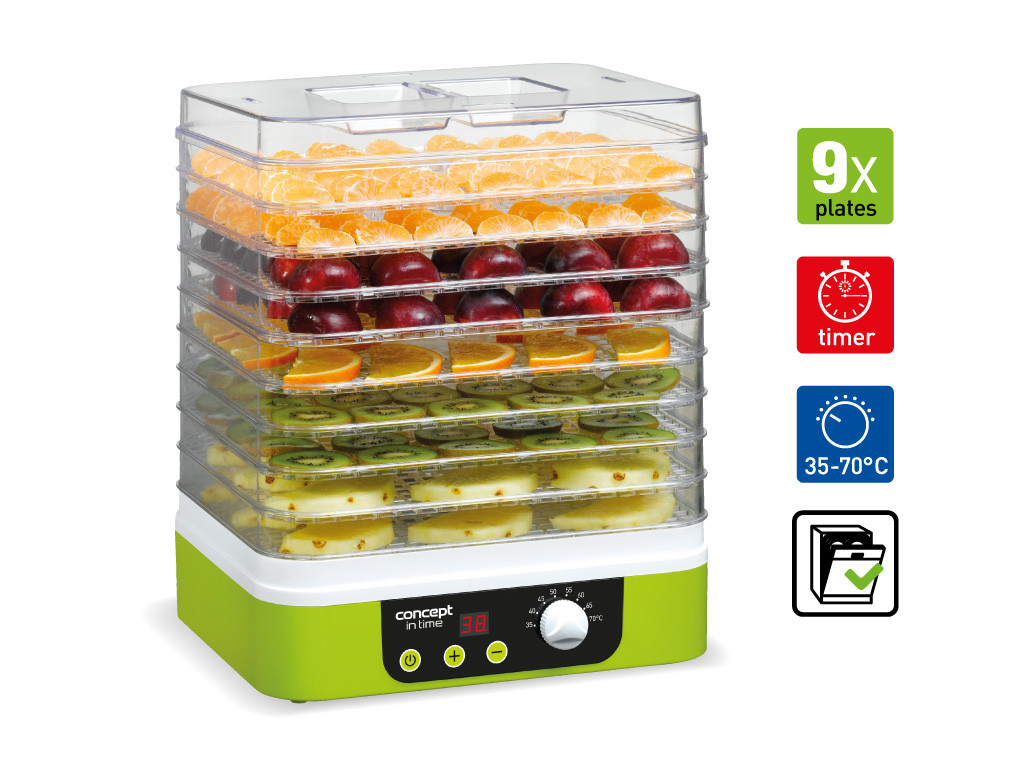 Sušička ovocia Concept SO 1060 IN TIME vám pomôže zdravo a chutne spracovať úrodu. Usušené potraviny si ľahko uchováte pre neskoršiu konzumáciu. Sušenie potravín patrí medzi najšetrnejšie metódy spracovania. Usušiť môžete ovocie, zeleninu, huby a dokonca aj bylinky a kvety. Potraviny si zachovajú vysoký obsah vitamínov aj minerálov. Usušiť môžete dokonca aj cestoviny alebo mäso. Sušička je vybavená praktickým časovačom a reguláciou teploty v rozmedzí od 35 do 70 ° C. Časovač bude myslieť za vás a po uplynutí nastavenej doby vás upozorní akustickým signálom a potom sa automaticky vypne. Šikovný doplnok sušičky je integrovaný ventilátor, ktorý napomáha rovnomernému sušeniu vo všetkých poschodiach. Praktický hranatý tvar uľahčuje uskladnenie a šetrí miesto na kuchynskej linke. Obdĺžnikové plata sa ľahko zmestia do umývačky.Sušička ovocia Concept SO 1060 IN TIMEPlynulá regulácia nastavenia teploty sušenia: od 35 do 70 ° CDigitálny časovačVentilátor pre rovnomerné sušenieObdĺžnikové sitá – vhodné do umývačkyBPA free – zdravotne nezávadný materiál sušiacich sítPočet sít 9 ksVeľkosť sít: 31,3 x 25,5 cmVýška sita: 3,3 cmTichá prevádzka: 46 dB (A)Poistka proti prehriatiuPríkon: 230 – 260 WNapätie: 220-240 VVyrobila spoločnosť Concept Príslušenstvo:9 hranatých sušiacich sít