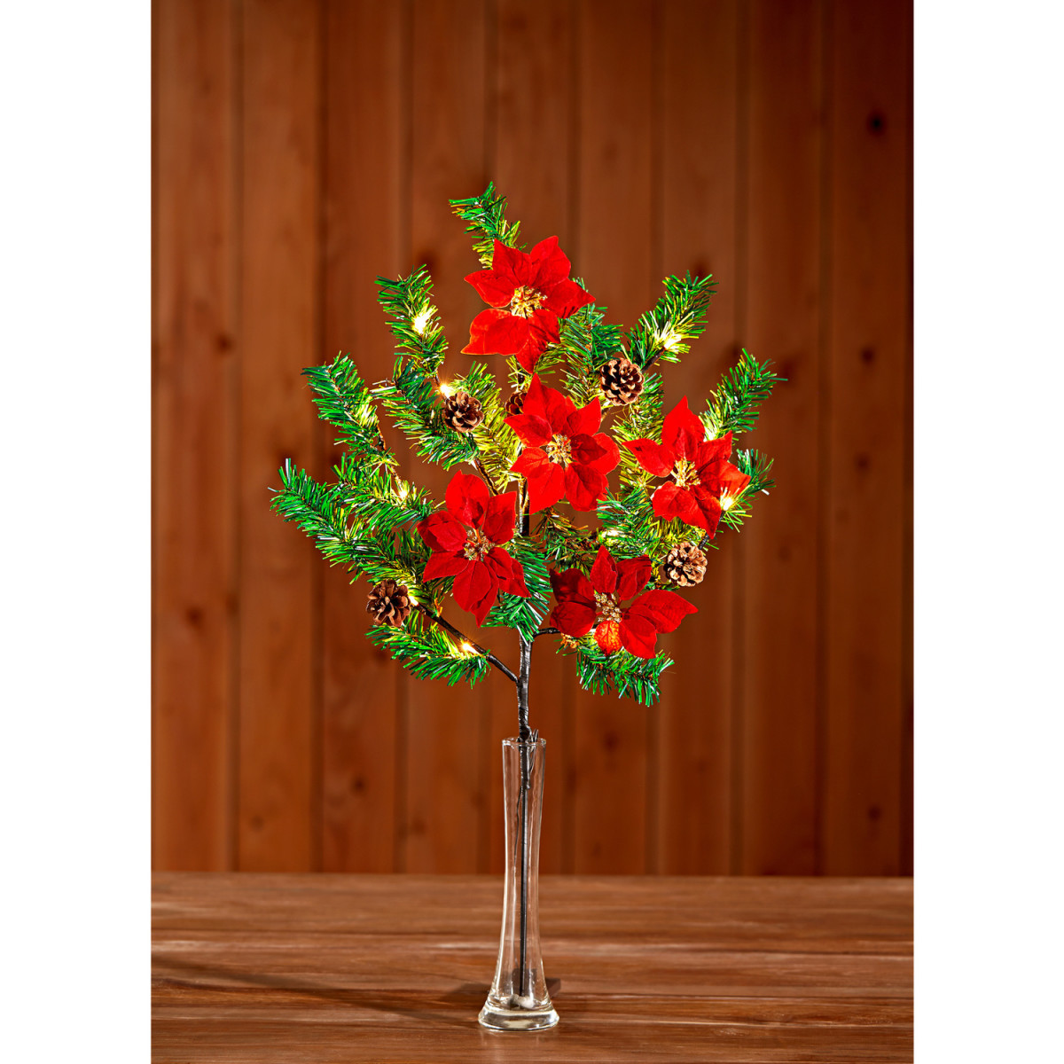 Košatá a svietiaca jedľová vetvička je dokonalá vianočná dekorácia. Je osadená 21 LED svetielkami a šíri tú pravú sviatočnú atmosféru. Výška cca 72 cm. Prevádzka na 3 x AA batérie 1,5 V (nie sú súčasťou balenia).Efektná svetelná dekorácia21 LEDZdobená vianočnými hviezdami a jedľovými šiškami