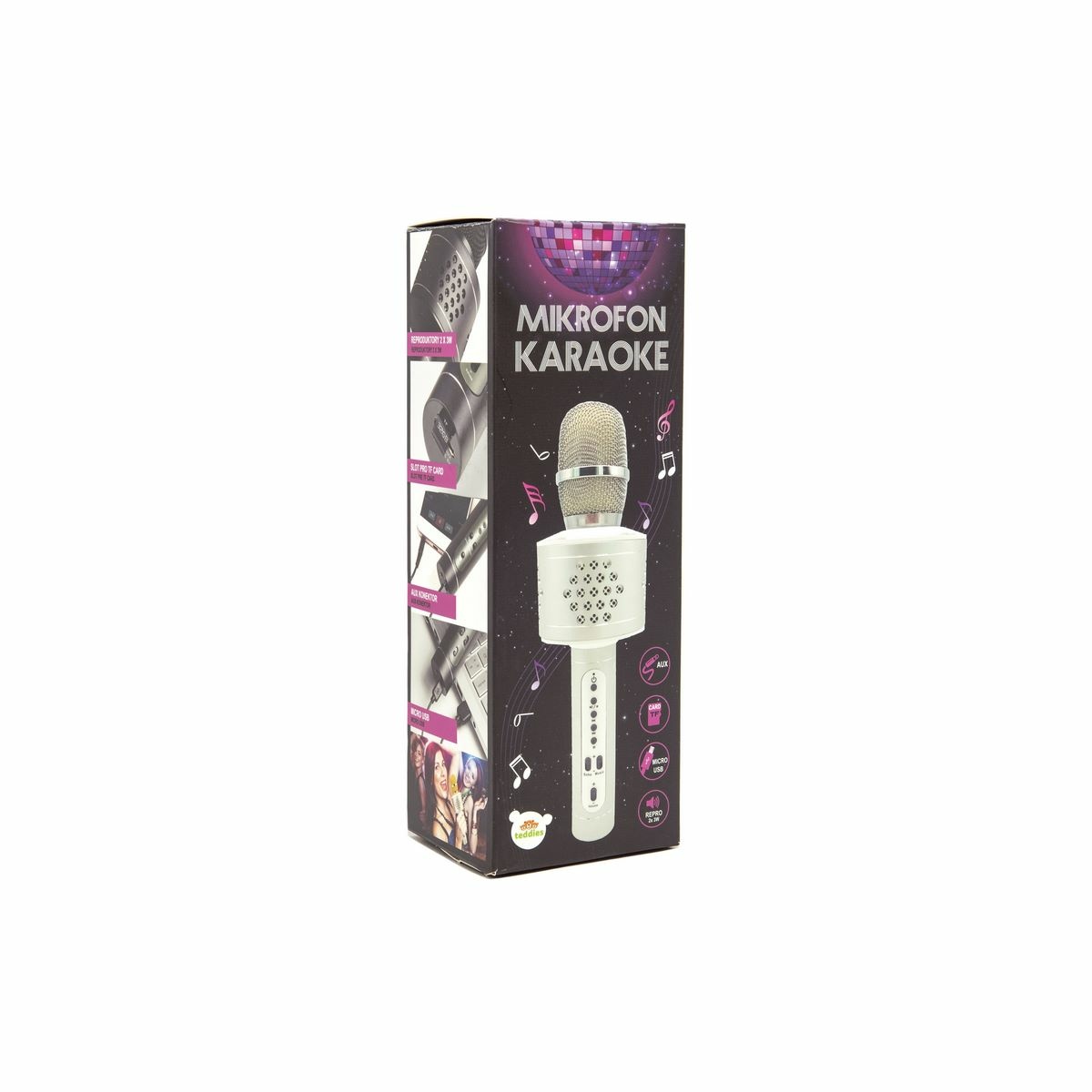 Bezdrôtový karaoke mikrofón nesmie chýbať na žiadnej párty. Pomocou kábla alebo Bluetooth prepojíte svoj telefón s mikrofónom. AUX konektor pomôže pri prehrávaní hudby z mobilného telefónu, PC, tabletu alebo MP3/MP4 prehrávača.Obsahuje slot pre TF card – zapnite mikrofón dlhším stlačením tlačidla ON, vložte pamäťovú kartu a mikrofón začne prehrávať hudbu uloženú na karte. Môžete začať spievať spoločne s mikrofónom.AUX konektor – zapojte kábel s koncovkou do AUX slotu a druhú koncovku USB do mobilu, tabletu, PC alebo MP3. Mikrofón začne prehrávať hudbu, ktorú si v pripojenom zariadení vyberiete a môžete začať spievať.Pri zapnutí mikrofónu Bluetooth pracuje spontánne. Ak spojenie nenadviaže, hľadá iné Bt spojenie. Ak mikrofón nemôžete spárovať, skontrolujte, či zariadenie, s ktorým chcete mikrofón spárovať podporuje A2DP.Možné nastavenie hlasitosti a intenzity hudby a ozveny.Technické údaje: