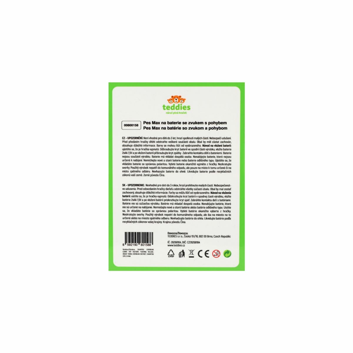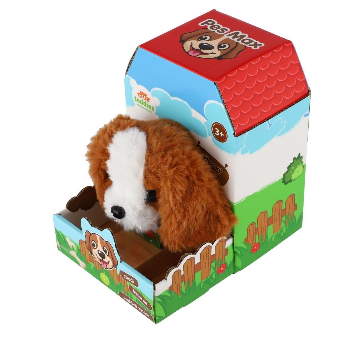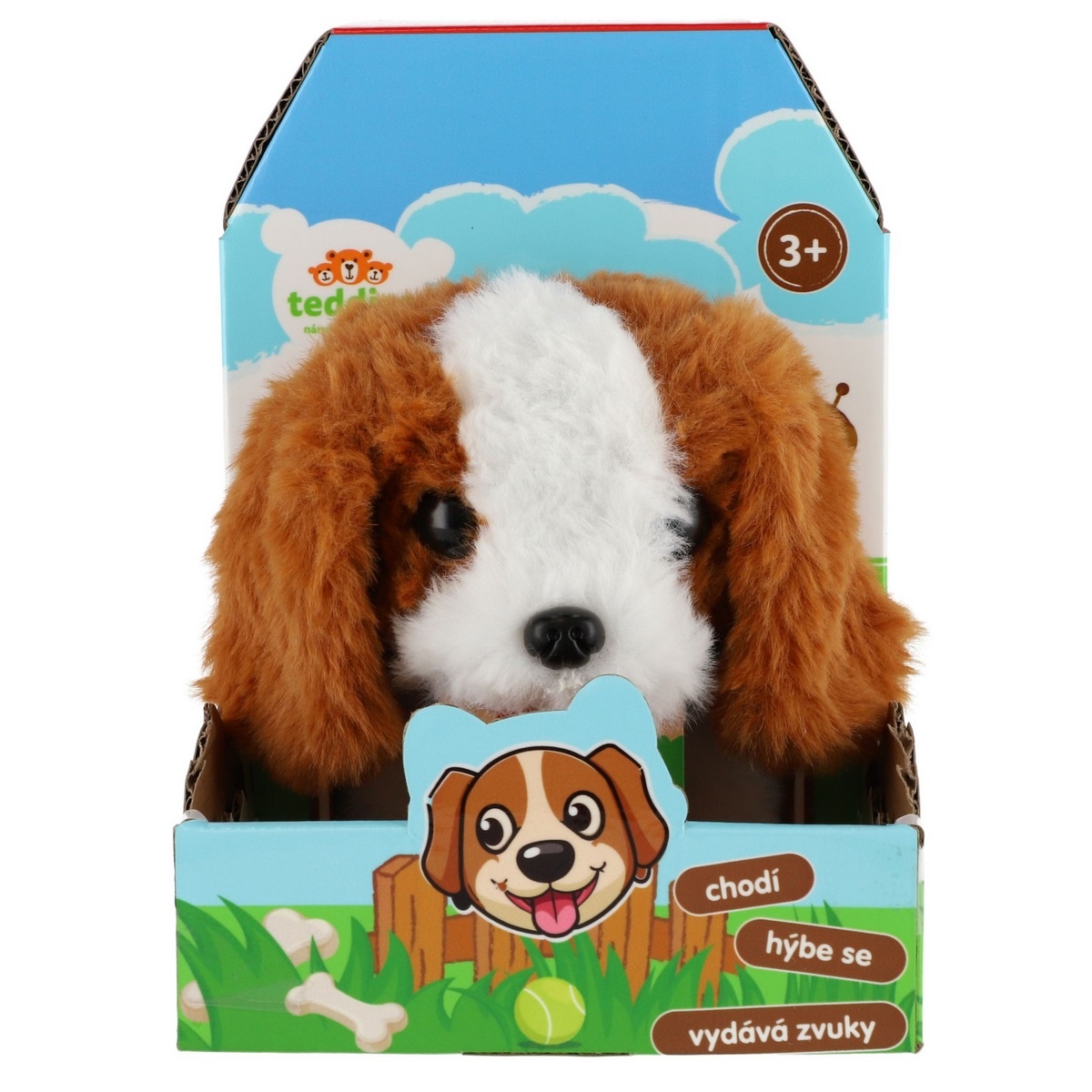 Roztomilý psík chodí dopredu aj dozadu a vydáva reálne zvuky štekania. Psík je balený v krabičke, ktorá je zároveň jeho búdou. Batérie 2x AA nie sú súčasťou výrobku. Rozmery balenia 13 x 19 x18 cm.