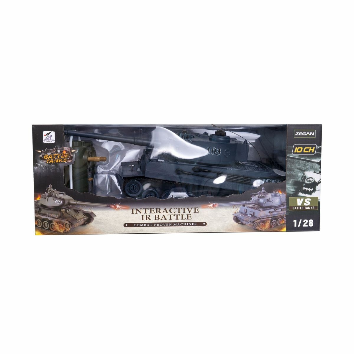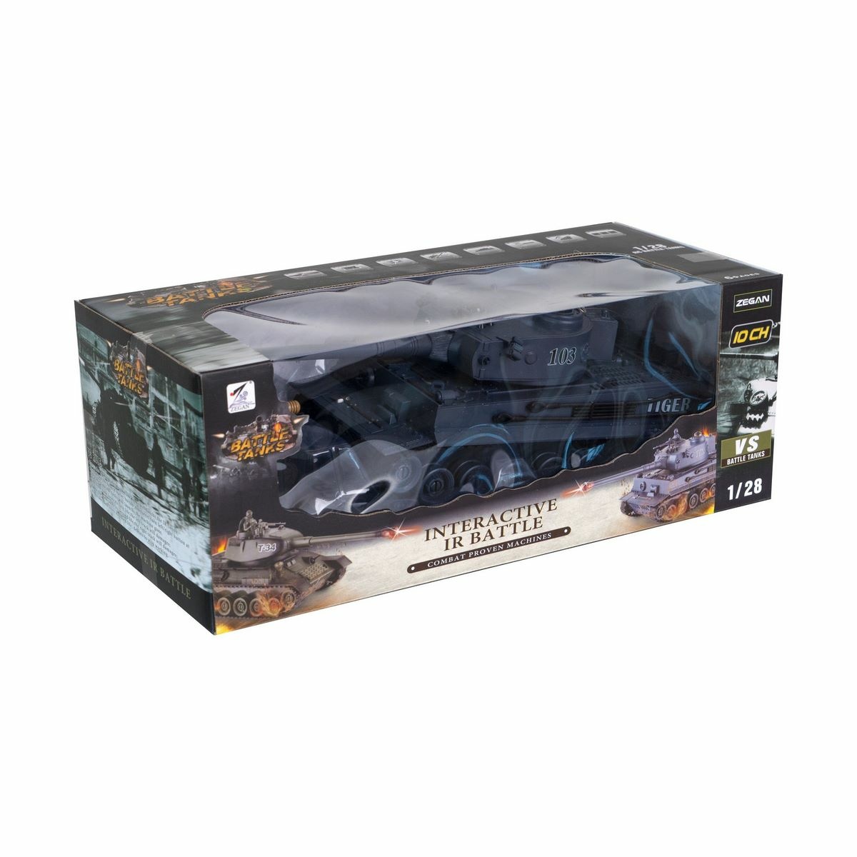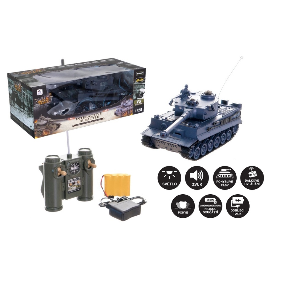 Tank RC TIGER s rozmerom 33 cm na diaľkové ovládanie určite poteší každého chlapca. Keď sa dá tank do pohybu, dokáže dosiahnuť rýchlosť až 5 km/minúta. Ovládač má dosah do 25 m od tanku. Jeho ovládanie je veľmi intuitívne, prístroj vydáva zvuky a svieti a pomôže tak chlapcom sa vžiť do situácie hry.Je vyrobený v mierke 1:28, je detailne prepracovaný a pôsobí veľmi realistickým dojmom. Iste tak poteší každého milovníka vojenskej techniky.Pri nákupe druhého tanku napr. pre tankovú bitku musí byť druhý tank na inej frekvencii. To znamená, že ak máte tank na frekvencii 40 MHz, druhý tank musí byť na frekvencii 27 MHz.Doba prevádzky je 15 minút na jedno nabitie. Je na batérie s dobíjacím packom, frekvencia 50 MHz.Je odolný voči mechanickému poškodeniu.
