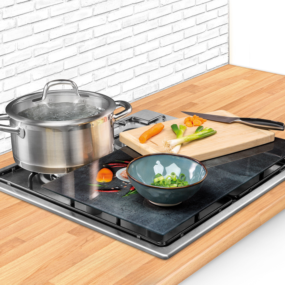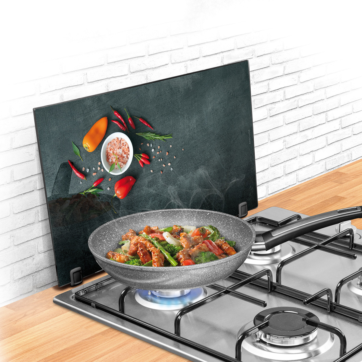 Rozšíri pracovný priestor v kuchyni ako prídavná odkladacia plocha na sporák a ochráni priestor za varnou doskou ako zvislá krycia plocha steny.S výškovo nastaviteľnými nožičkami, prísavkami a opierkami pre stabilné a bezpečné použitie so sklokeramickými, indukčnými, elektrickými a plynovými varnými doskami.Vyrobené z tvrdeného skla a odolného plastu. Používajte len na vypnutých varných doskách. 3 roky záruka.