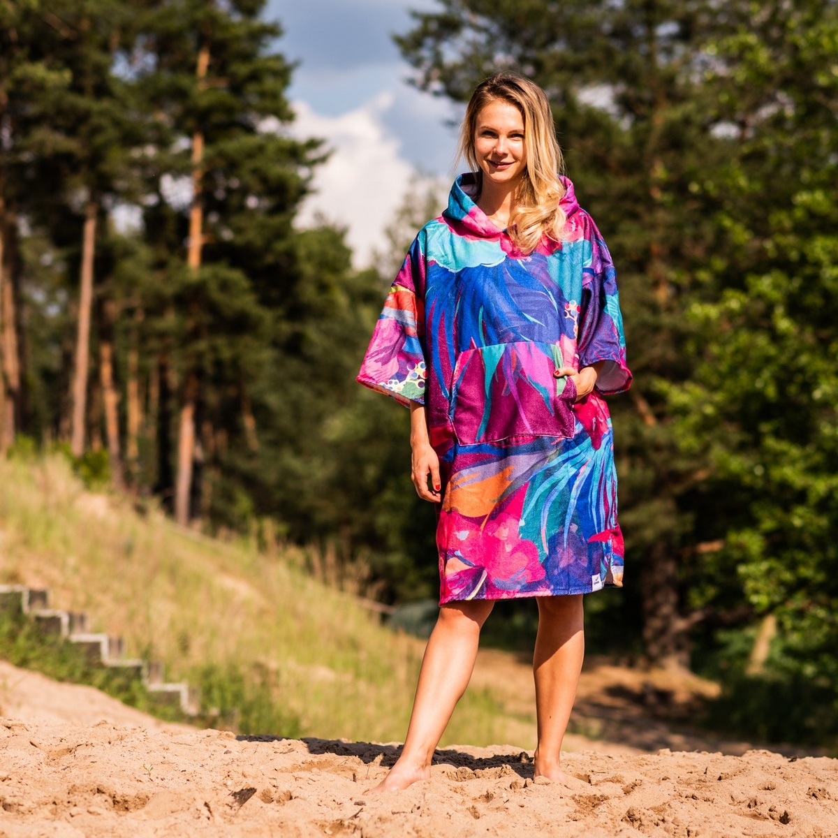 Dizajn Paradise patrí k našim bestsellerom a my vieme prečo! Výrazné farby, ručne maľovaný návrh a jedinečná kombinácia kvetov a tropických listov. Nové pončá majú vychytávky ako sú vnútorné tajné vrecko so zipsom alebo pevnejšia ľahko tvarovateľná kapucňa. Materiál z mikrovlákna je jemný k pokožke a vďaka antibakteriálnym vlastnostiam len tak nezasmradne. Najväčšou výhodou tohto uterákového materiálu je to, že rýchlo schne.