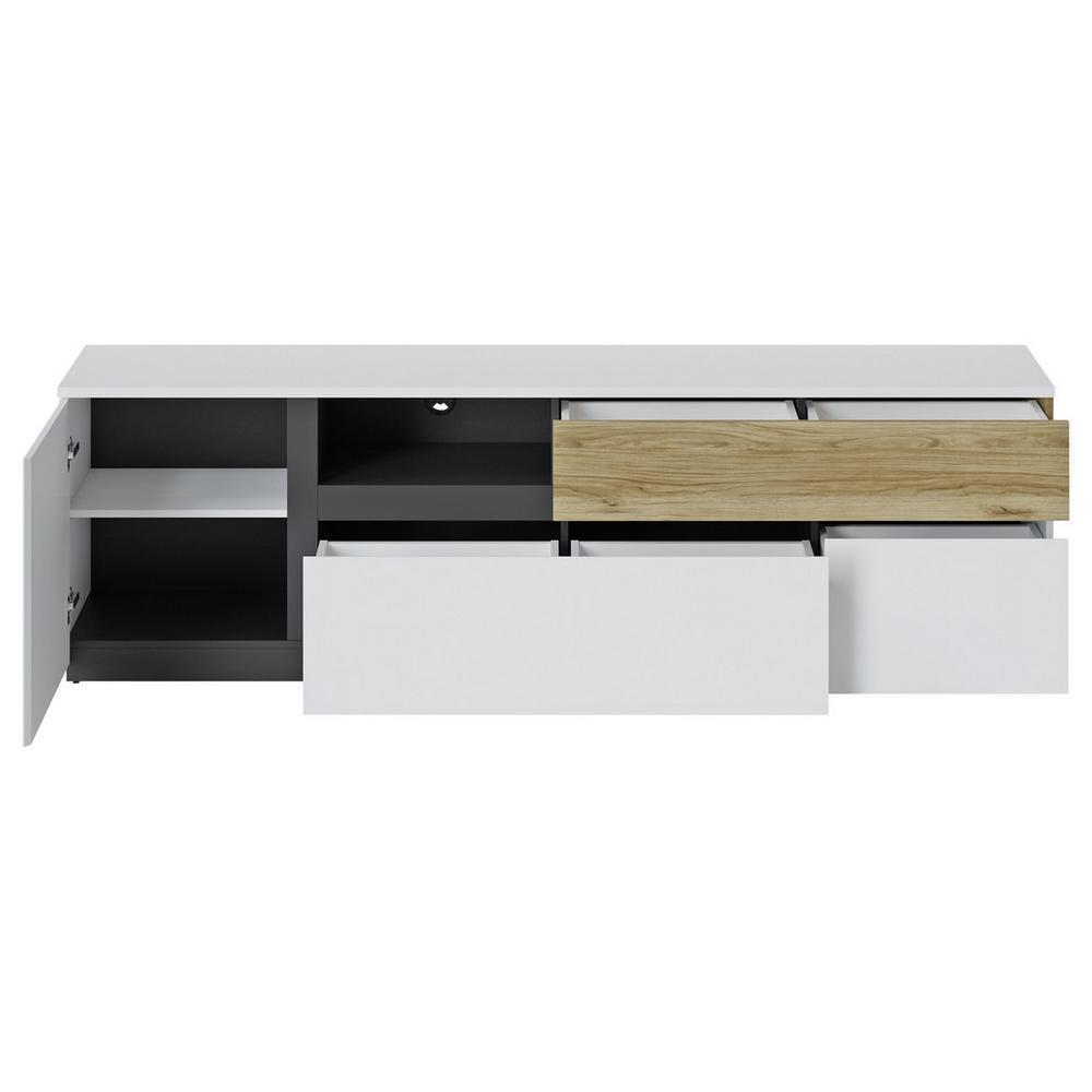 Jedinečný dizajn TV dielu NOVENA je skĺbený s vysokou funkčnosťou. Vyrobený je s dekormi bielej a dubovej farby, o pekné zvýraznenie sa postarajú čierne akcenty. Povrch je potiahnutý melamínovou živicou, čo zaistí ľahkú údržbu a dlhovekosť. S rozmermi asi 210,5 x 63,1 x 40 cm (Š x V x H) získate bohatý úložný priestor na váš plochý televízor, elektroniku a aj iné veci, ktoré potrebujete schovať. Úložný priestor tvoria dva priečinky za jednými otočnými dvierkami bez úchytiek, so systémom soft-close. Priečinok rozdeľuje jedna vkladacia polica, ktorú možno zaťažiť do 5 kg. Je výškovo nastaviteľná, a tým umožňuje flexibilitu v ukladaní. Súčasťou je aj 5 ďalších priečinkov v troch zásuvkách a jeden otvorený priečinok na prijímače. Celkovo má táto skrinka maximálnu nosnosť 75 kg. Splňte si sen o bývaní s nadčasovým nábytkom NOVENA s bezkonkurenčným pomerom ceny a výkonu! Objavte aj ďalšie kúsky z tejto série!