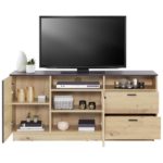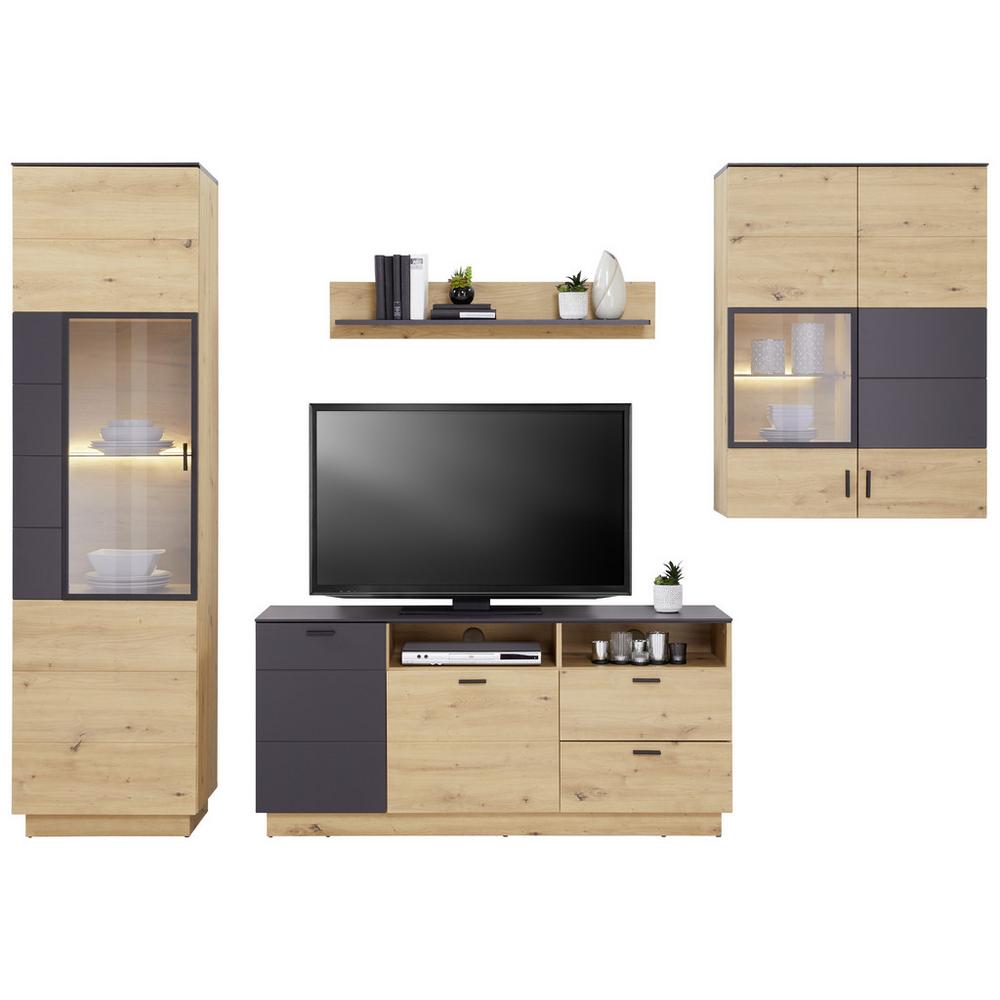 Priamočiary, domácky, priestranný: nábytok TONALE sa prezentuje nadčasovým trendovým dizajnom, ktorý možno ľahko kombinovať s rôznymi štýlmi zariadenia. Vyrobený je z robustného, dreveného dekoru, ktorý presvedčí farebnou kombináciou kozmickej sivej a dub artisan. Čierne úchytky dotvárajú vzhľad harmonickým spôsobom a melamínový povrch sa postará o dlhodobo krásny vzhľad a ľahkú údržbu. TV diel TONALE má veľkorysé rozmery okolo 146,8 x 68,6 x 40 cm (Š x V x H), a ponúka premyslený úložný priestor pre hernú alebo filmovú zbierku, plochý televízor či dekorácie. V zásuvkách a za dvomi dvierkami s dvomi polohovateľnými policami ťažíte z flexibilného priestoru. Dve otvorené priehradky dobre poslúžia na prijímače. Samozrejmosťou je aj diskrétny otvor na káble. Získajte nábytok TONALE ako funkčný a štýlový doplnok vášho domova! Dúfame, že si ho užijete!