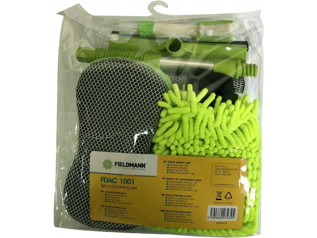 Sada obsahuje: stierka na okná 1 ks, čistič na ventilátory, špongia, utierka z mikrovlákna. Vyrobené českou spoločnosťou Fieldmann.