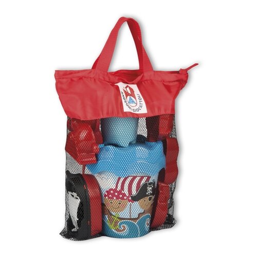 Farebná sada na piesok vyrobená z kvalitných plastov v Taliansku pre veselú hru malých pirátov na pieskovisku. Obsahuje: kýblik, kanvičku, sitko, lopatku, hrabličky a 4 formičky s pirátskou tematikou a lodičku o veľkosti 15 cm. Objem kanvičky je 0,5 l, priemer vedierka je 17 cm. Všetko je uložené v praktickej cestovnej sieťovanej taške.