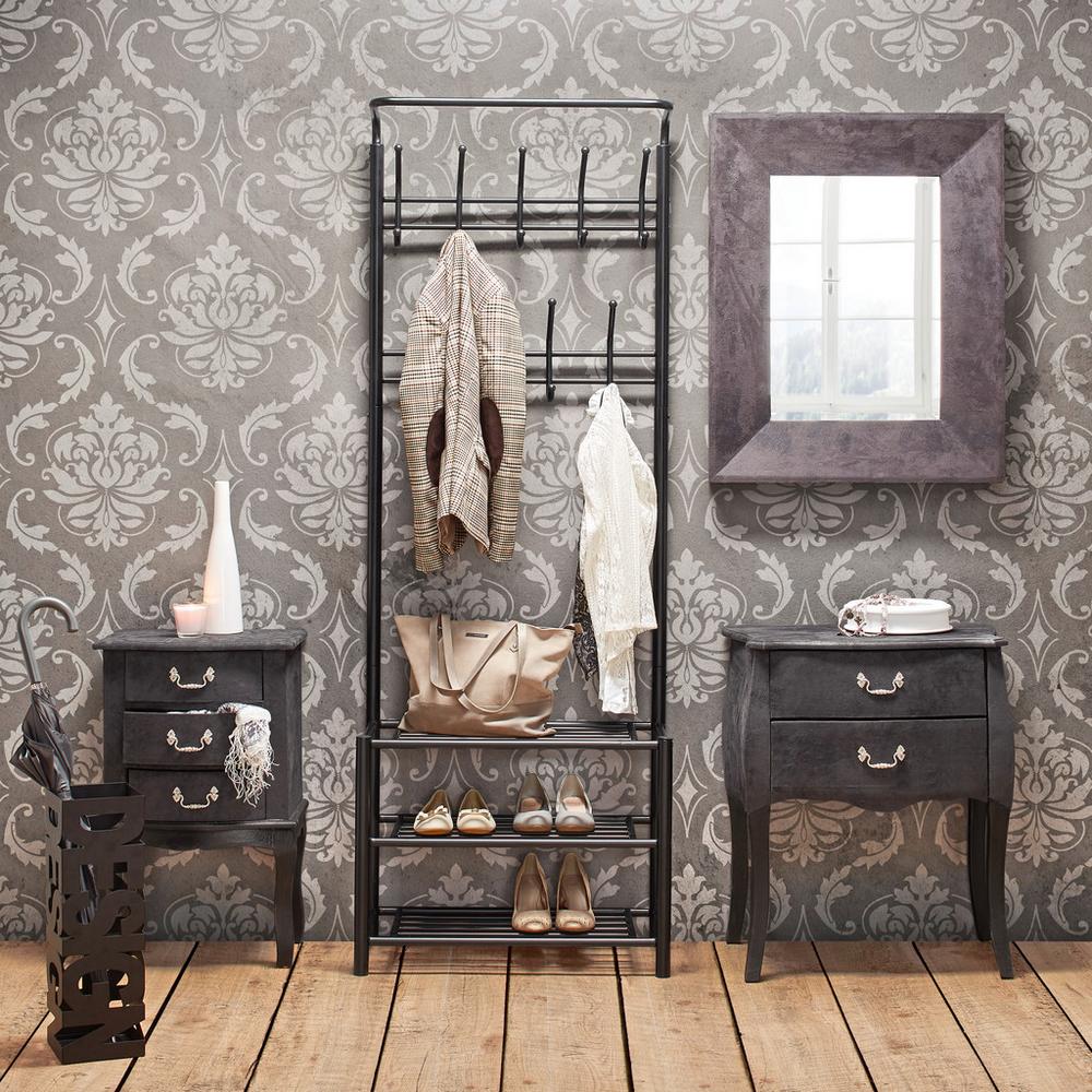 Predstavujeme Vám kovový šatníkový stojan v čiernej farbe, s rozmermi 67 x 185 x 32 cm (Š/V/H), ktorý je vybavený 18 háčikmi a má max. nosnosť 120 kg. Saká a kabáty si tak budete môcť bez problémov zavesiť. Do spodných 3 priehradok si môžete odložiť topánky, či doplnky. So stojanom AMELIA ušetríte vo Vašej domácnosti viac priestoru!