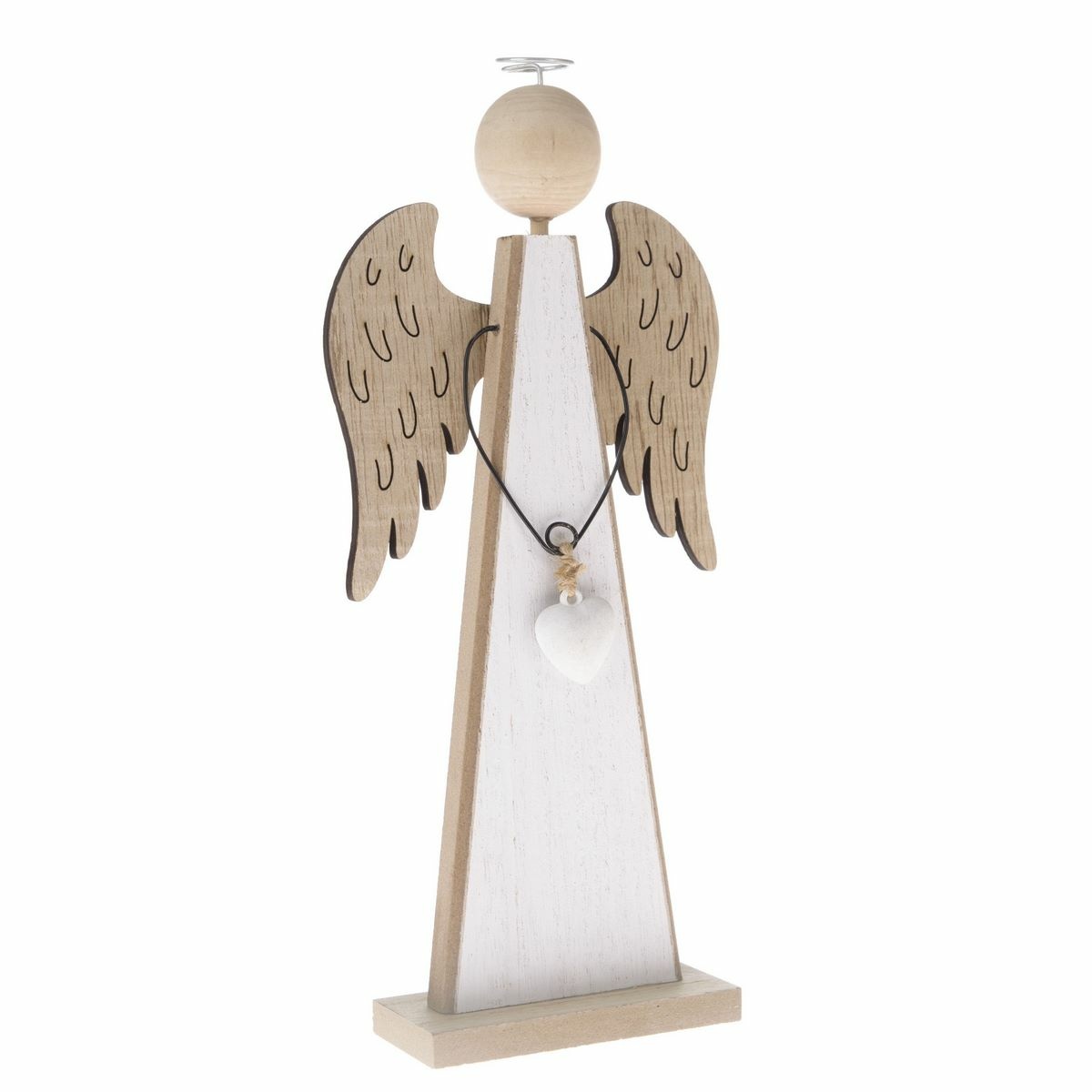 Nádherná minimalistická dekorácia bude vyzerať skvele v každom interiéri. Anjel má nad hlavou svätožiaru a v rukách drží malé srdiečko. Dekorácia stojí na drevenom podstavci.