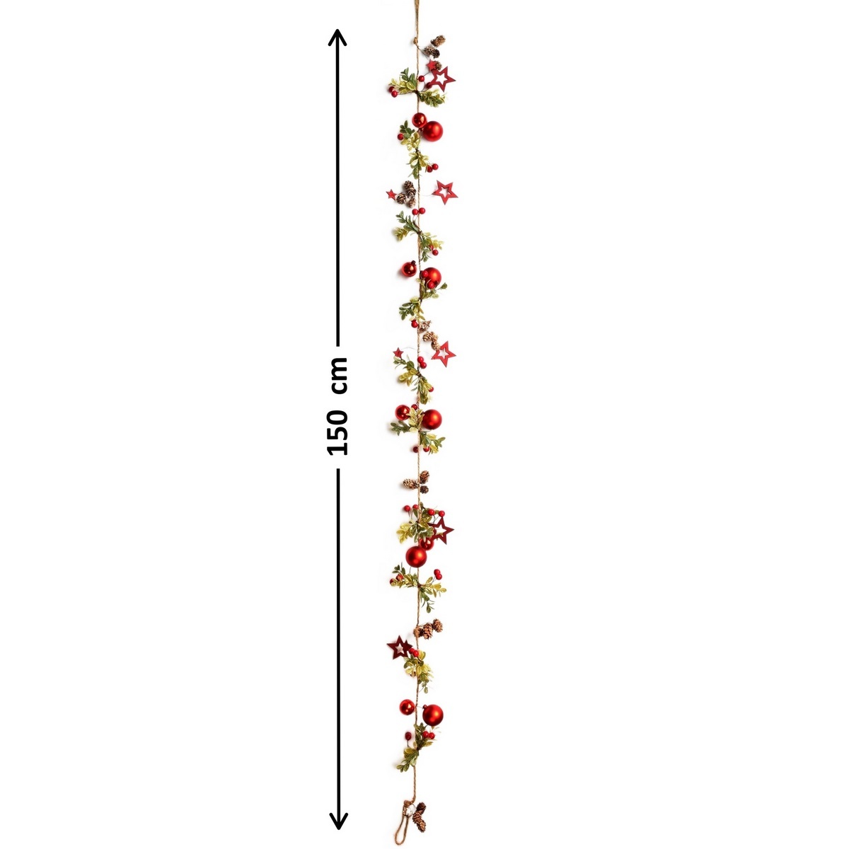 Vytvorte si dokonalú vianočnú atmosféru pomocou krásne zdobenej girlandy s dĺžkou 150 cm, ktorá vnesie do vášho domova kúsok prírody. Girlanda je bohato zdobená drevenými hviezdami, umelými červenými guľôčkami, červenými bazami, pozlátenými vetvičkami. Na oboch koncoch girlandy sa nachádzajú praktické pútka na zavesenie, ktorým ju ľahko umiestnite na požadované miesto.