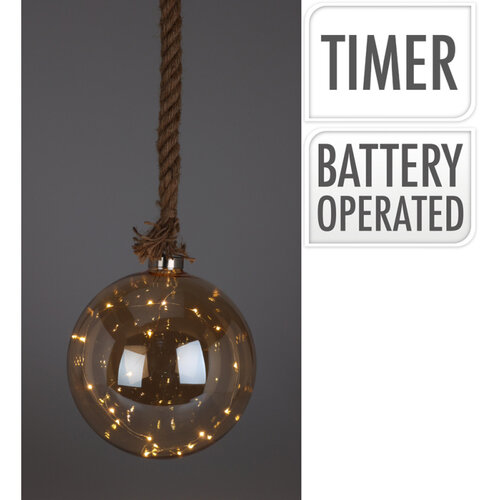 Táto pekná svetelná dekorácia bude elegantne visieť napríklad vo vašej obývačke alebo jedálni. Jej vintage štýl a 20 teplých bielych LED diód budú ideálne na osvetlenie vášho interiéru.Táto guľa je vyrobená zo skla a má priemer 20 cm. Je pripevnená k jutovému povrazu s dĺžkou 80 cm.Žiarovky v tejto dekorácii fungujú vďaka časovaču.Na batérie 2x AA, ktoré nie sú súčasťou balenia.