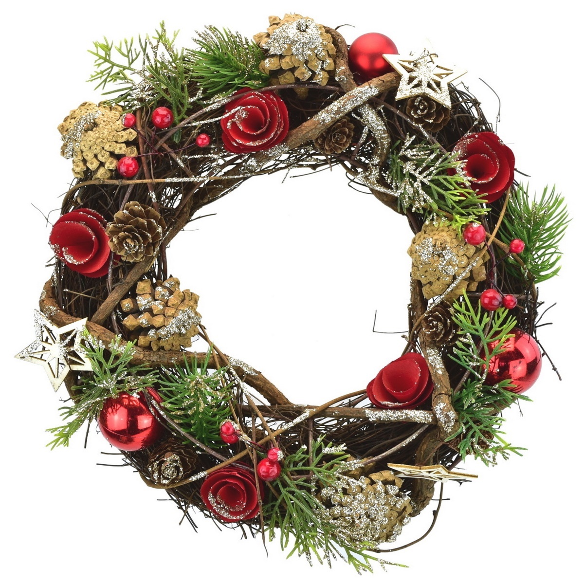 Ozdobný ratanový veniec s prírodnými prízdobami bude krásnou vianočnou dekoráciou na vchodové dvere aj do interiéru. Veniec je kvalitne spracovaný a dekorovaný drevenými červenými ružičkami, lesklými guľôčkami, prírodnými šiškami a umelými zelenými vetvičkami.
