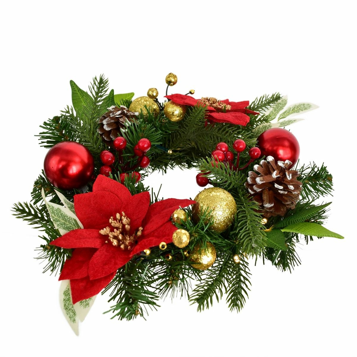Ozdobte svoj domov a vytvorte kúzelnú vianočnú atmosféru. Tento nádherný veniec s priemerom 30 cm je jedinečným kúskom, ktorý sa skvele hodí na predné dvere alebo ako stredobod vašich vianočných osláv. Veniec je doplnený svietiacou reťazou s 10 LED svetlami teplej bielej farby. Je bohato zdobený červenými poinsetiami, červenými a zlatými guľôčkami, bazami a šiškami, ktoré sú starostlivo upevnené na realistickej umelej zelenej čečine. Vetvičky cezmíny dodávajú venci prírodný vzhľad a harmóniu. Napájanie: 2 AA batérie (nie sú súčasťou balenia)