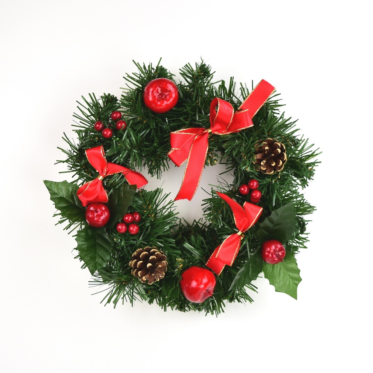Tradičný vianočný venček z umelej zelenej čečiny je ozdobený prírodnými šiškami, červenými mašľami, bazou a jabĺčkami. Je vhodný pre interiérovú dekoráciu i vonkajšiu výzdobu.
