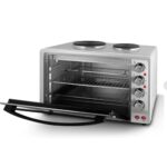 Multifunkčná elektrická rúra ponúka možnosť varenia, grilovania, pečenia, ražnenia, zapekania, opekania či použitia výhod horúceho vzduchu. Má elegantný dizajn, strieborné prevedenie s nehrdzavejúcimi doplnkami.Vlastnosti a parametre: