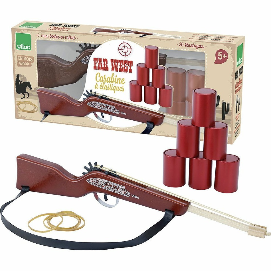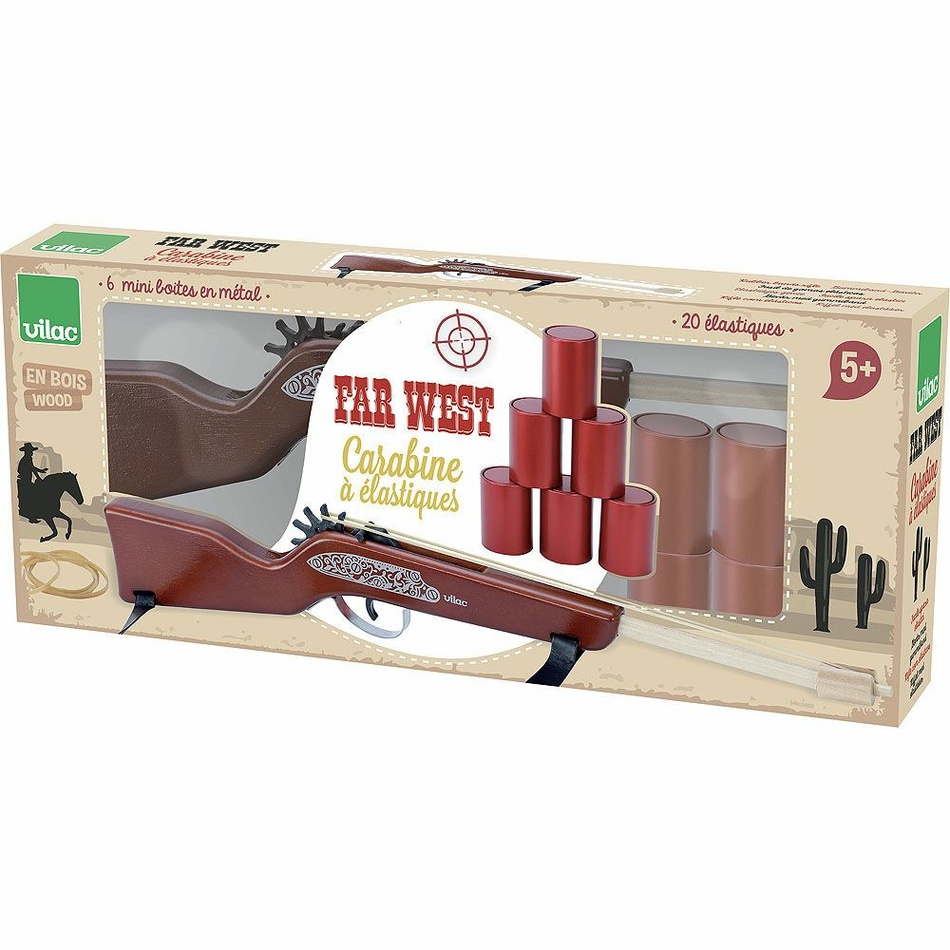 Hej kovboji! Vitajte na Starom západe. Budete dostatočne zruční, aby ste zostrelili všetky plechovky pred sebou? So svojou puškou dobre mierte, aby ste mohli súťažiť so slávnymi menami ako Billy the Kid alebo Calamity Jane!! Strieľa sa gumičkami, ktoré sa naťahujú na pušku.Obsah balenia: