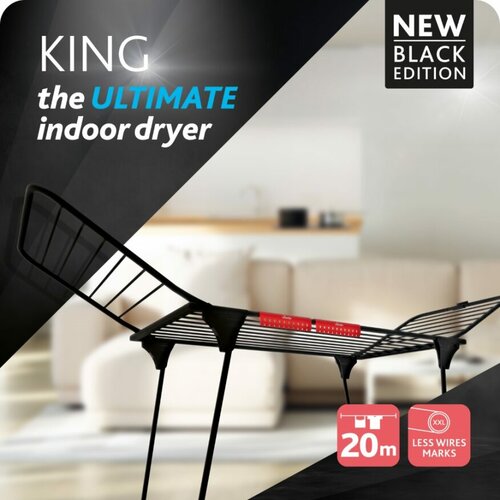Sušiak na bielizeň Vileda King je praktickou a šikovnou pomôckou pre ľahké sušenie v každej domácnosti. Teraz v štýlovom matne čiernom prevedení.Silné hliníkové drôty zabránia stláčaniu bielizne. Sušiak na bielizeň je robustný a stabilný vďaka extra bezpečným a pevným nohám. Veľkou výhodou sú kolieska, zámok krídiel a držiak pre malé predmety, ktorý vám umožní ľahké a rýchle zavesenie ponožiek či spodnej bielizne bez potreby štipcov.Technické parametre a špecifikácie: