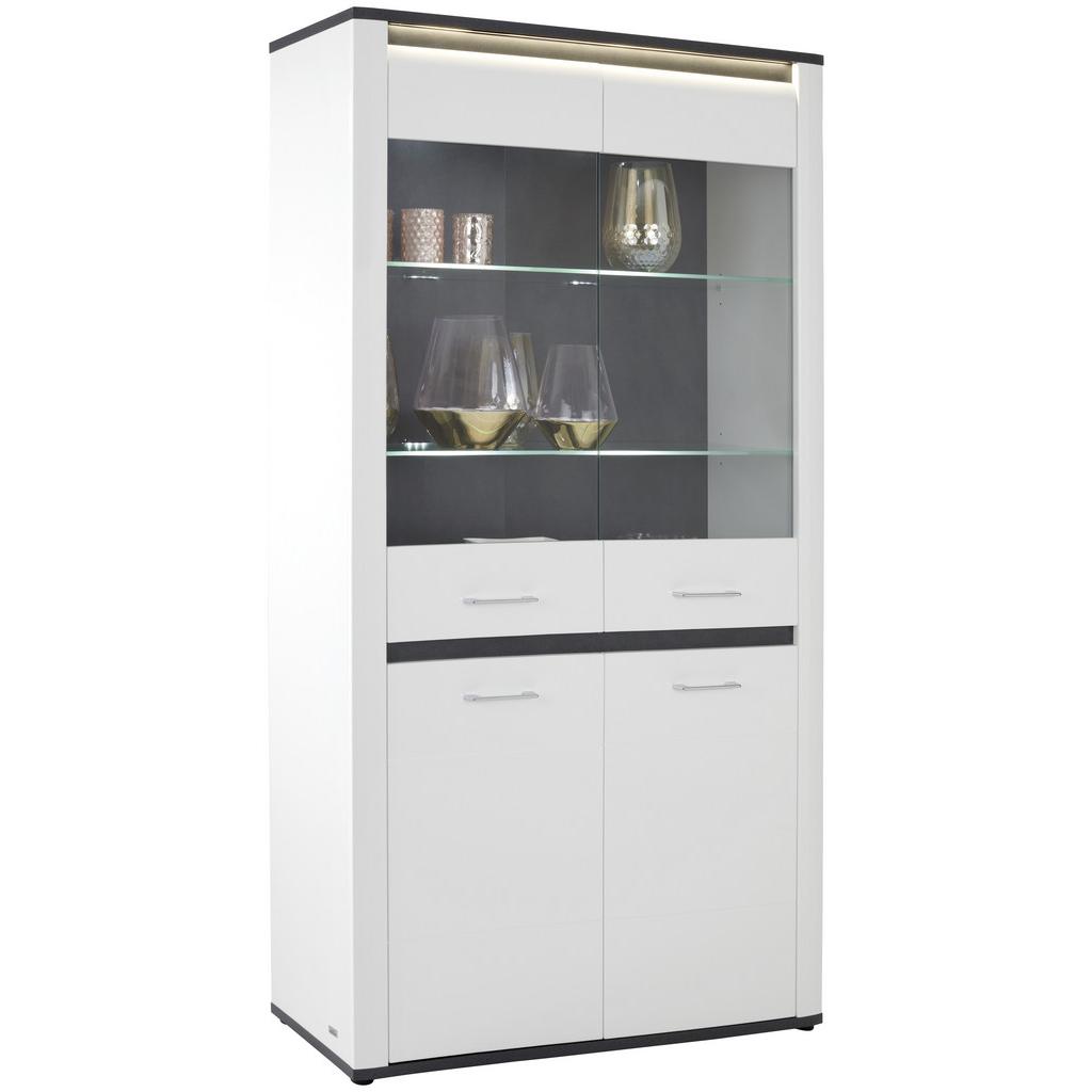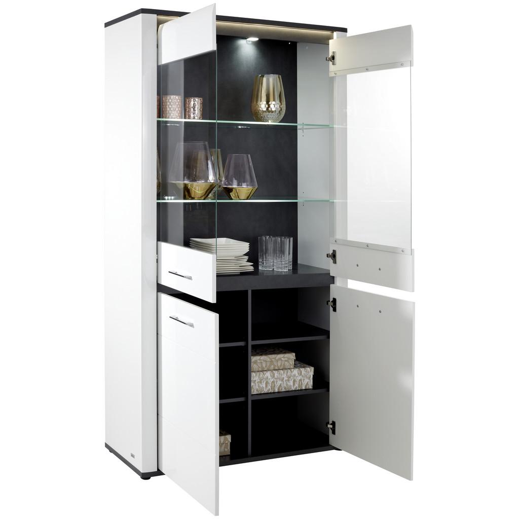 Vitrína v dekore biela, vysoký lesk/ Matera tmavá, so 4 dverami, vrátane 3 vkladacích políc a osvetlenia. Š/V/H: cca 109/200/37,5 …