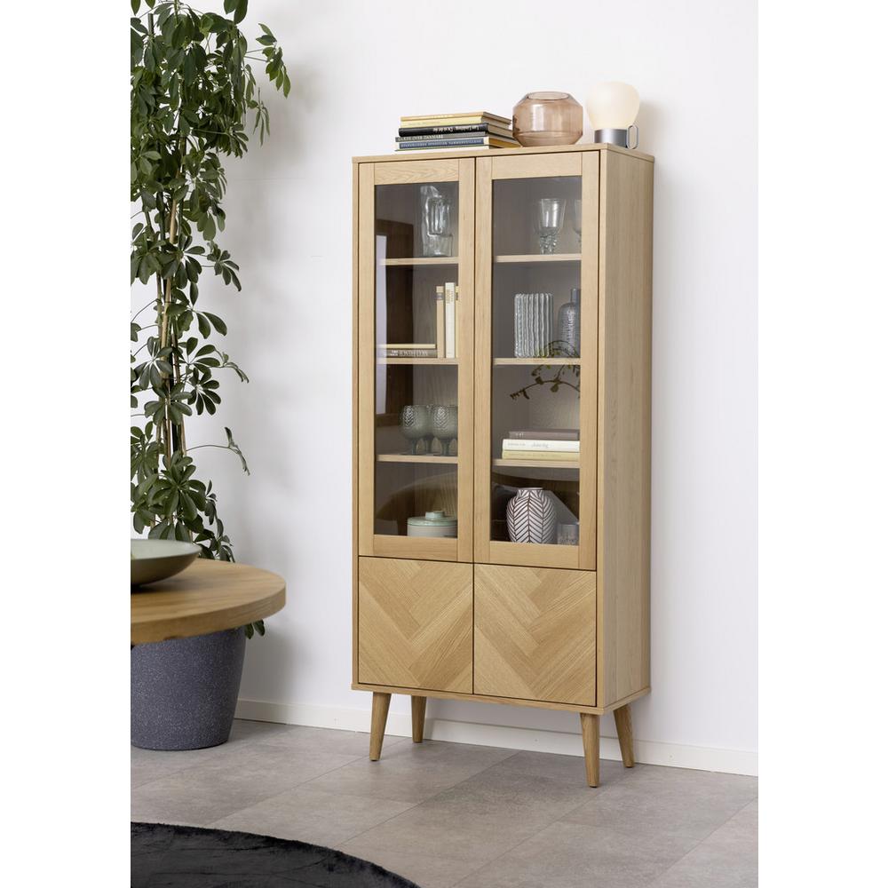 Vysoká vitrína NAGANO je skvelou voľbou do obývacej izby, knižnice alebo jedálne. S rozmermi cca 80 x 178 x 37 cm (Š / V / H) je vyrobená z MDF materiálu a dvierkami z dubovej dyhy vo vzhľade parkiet a so sklenenými vložkami. Dopĺňajú ju štyri pevné, drevené nohy. Za dvomi otočnými dvierkami ponúka interiér nábytku desať priehradiek. Vďaka svojmu jednoduchému dizajnu a univerzálnej štruktúre bude táto skrinka perfektná v minimalistických interiéroch. Vitrínu môžete doplniť aj o ostatný nábytok zo série NAGANO v rovnakom dizajne vo vzhľade parketovej podlahy. Kombinuje moderný severský design s ľahkým retro náznakom! Stavte na kvalitný nábytok, ktorý bude nadčasový, praktický a vydrží vám dlhé roky!