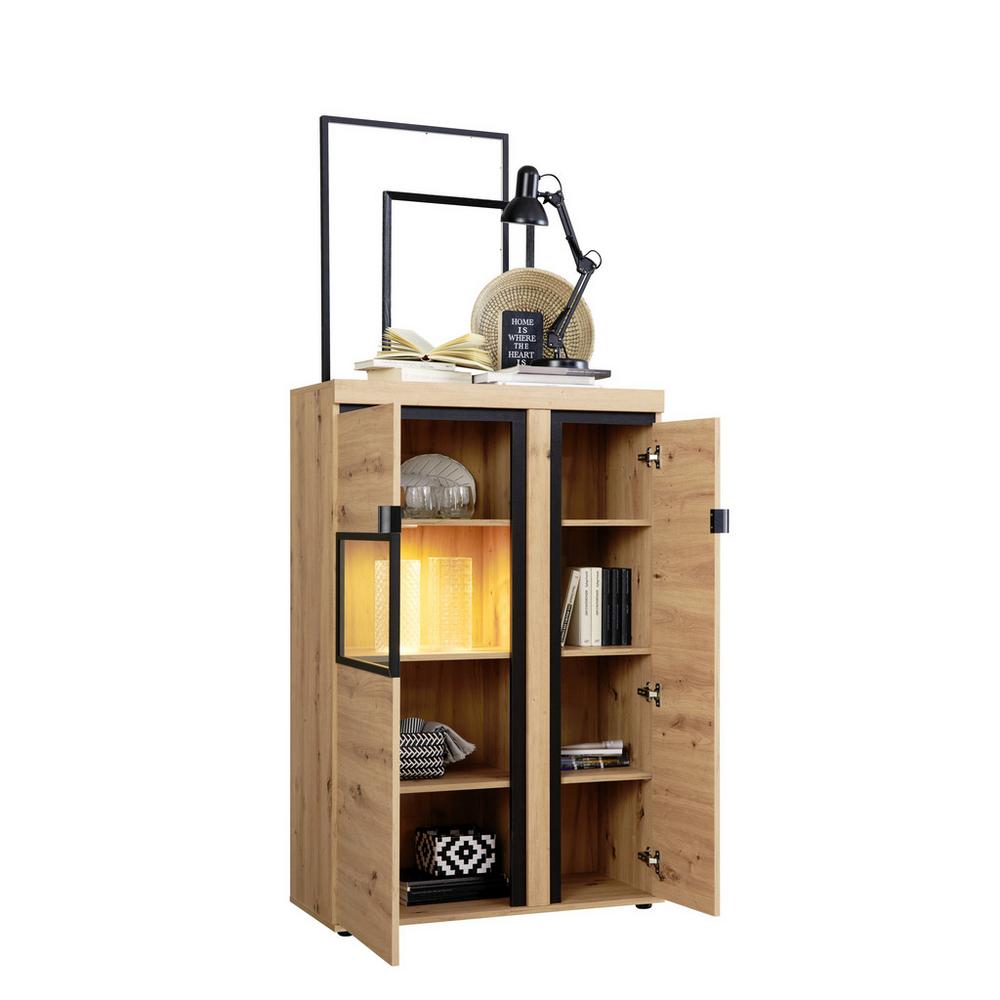Táto vysoká vitrína zaujme svojím nadčasovým vzhľadom s jasnými líniami. Stane sa praktickým pútačom vášho domova, pretože disponuje aj veľkým úložným priestorom. Vitrína, s rozmermi približne 89 x 138,1 x 40,5 cm (Š x V x H), obsahuje celkom 6 výškovo nastaviteľných políc za dvomi otočnými dvierkami s tlmeným dovieraním. Ľavé dvierka vizuálne zvýrazňuje prvok z tvrdeného farebného skla. Vďaka integrovanému LED osvetleniu tu môžete prezentovať rôzne dekoratívne predmety. Nábytok je vyrobený z materiálu na báze dreva. Kombinuje dekor dubu s farbou čierneho plastu, a je potiahnutý melamínovou živicou pre väčšiu odolnosť povrchu. Rukoväť u dvierok aj nožičky majú tiež čiernu farbu. Táto vitrína je súčasťou nábytkovej série do obývacej izby NYON. Vyberajte a kombinujte jednotlivé kúsky, a vytvorte si tak miestnosť jednotnom dizajne!
