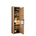 Táto vysoká vitrína zaujme svojím nadčasovým vzhľadom s jasnými líniami. Stane sa praktickým pútačom vášho domova, pretože disponuje aj veľkým úložným priestorom. Vitrína, s rozmermi približne 56,8 x 200,1 x 40,5 cm (Š x V x H), obsahuje celkom 5 výškovo nastaviteľných políc na uloženie rôzne veľkých vecí. Vizuálne zvýraznenie dverí s tlmeným dovieraním predstavuje prvok z tvrdeného farebného skla. Vďaka integrovanému LED osvetleniu tu môžete prezentovať rôzne dekoratívne predmety. Nábytok je vyrobený z materiálu na báze dreva. Kombinuje dekor dubu s farbou čierneho plastu, a je potiahnutý melamínovou živicou pre väčšiu odolnosť povrchu. Rukoväť u dvierok aj nožičky majú tiež čiernu farbu. Táto vitrína je súčasťou nábytkovej série do obývacej izby NYON. Vyberajte a kombinujte jednotlivé kúsky, a vytvorte si tak miestnosť jednotnom dizajne!