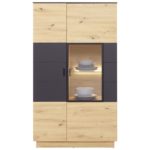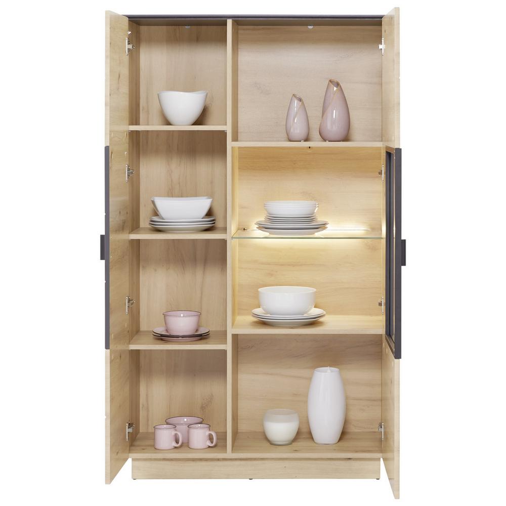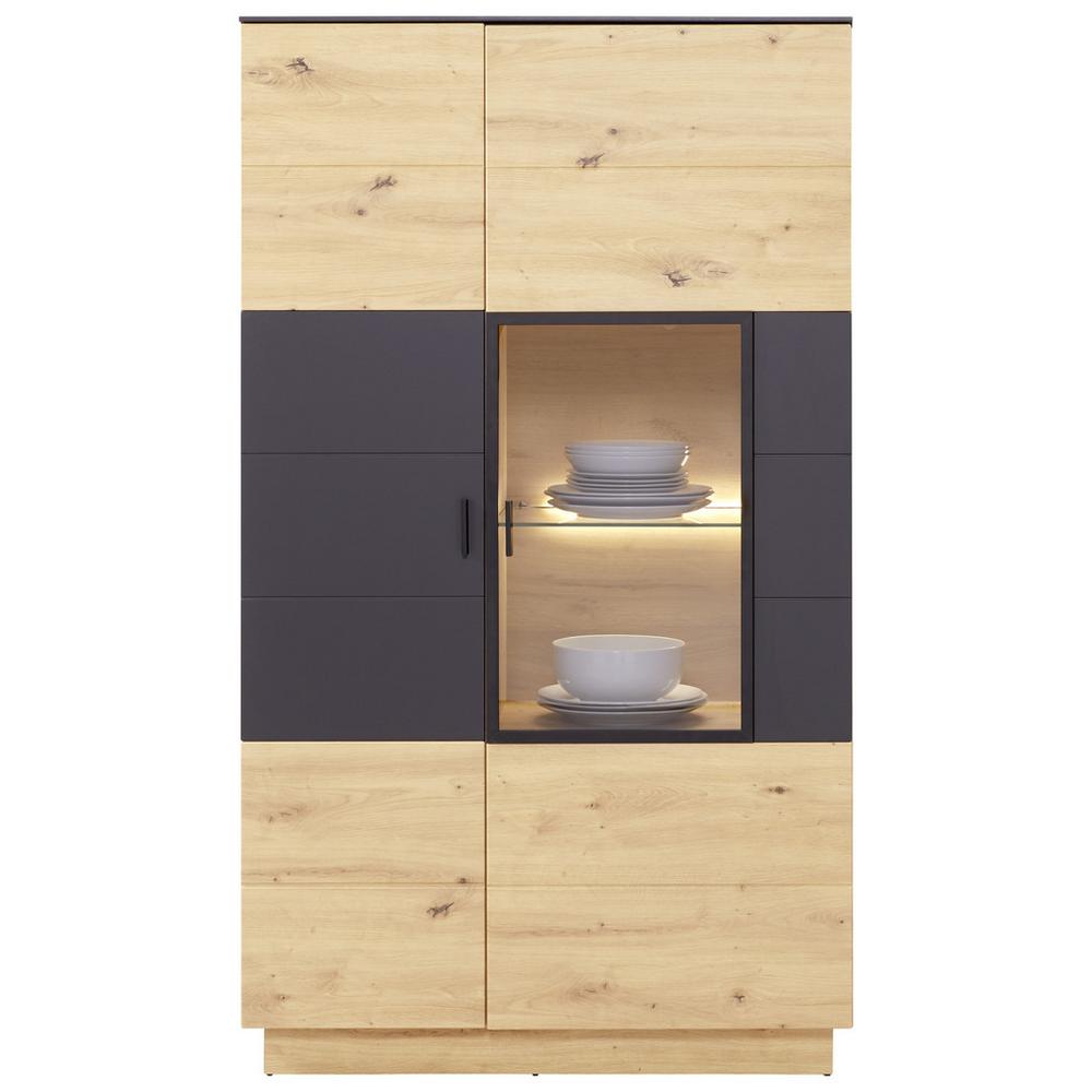 Priamočiary, domácky, priestranný: nábytok TONALE sa prezentuje nadčasovým trendovým dizajnom, ktorý možno ľahko kombinovať s rôznymi štýlmi zariadenia. Vyrobený je z robustného, dreveného dekoru, ktorý presvedčí farebnou kombináciou kozmickej sivej a dub artisan. Čierne úchytky dotvárajú vzhľad harmonickým spôsobom a melamínový povrch sa postará o dlhodobo krásny vzhľad a ľahkú údržbu. Vitrína TONALE má veľkorysé rozmery okolo 93,5 x 163,5 x 40 cm (Š x V x H), a ponúka premyslený úložný priestor na rôzne veci, v závislosti od toho, v ktorej miestnosti bude skrinka využitá. Za dvomi dvierkami so šiestimi polohovateľnými policami ťažíte z flexibilného priestoru. Presklená časť pravých dvierok ponúka miesto na vystavenie obľúbených dekorácií. Získajte nábytok TONALE ako funkčný a štýlový doplnok vášho domova! Dúfame, že si ho užijete! Upozorňujeme, že osvetlenie nie je súčasťou balenia.