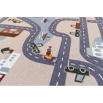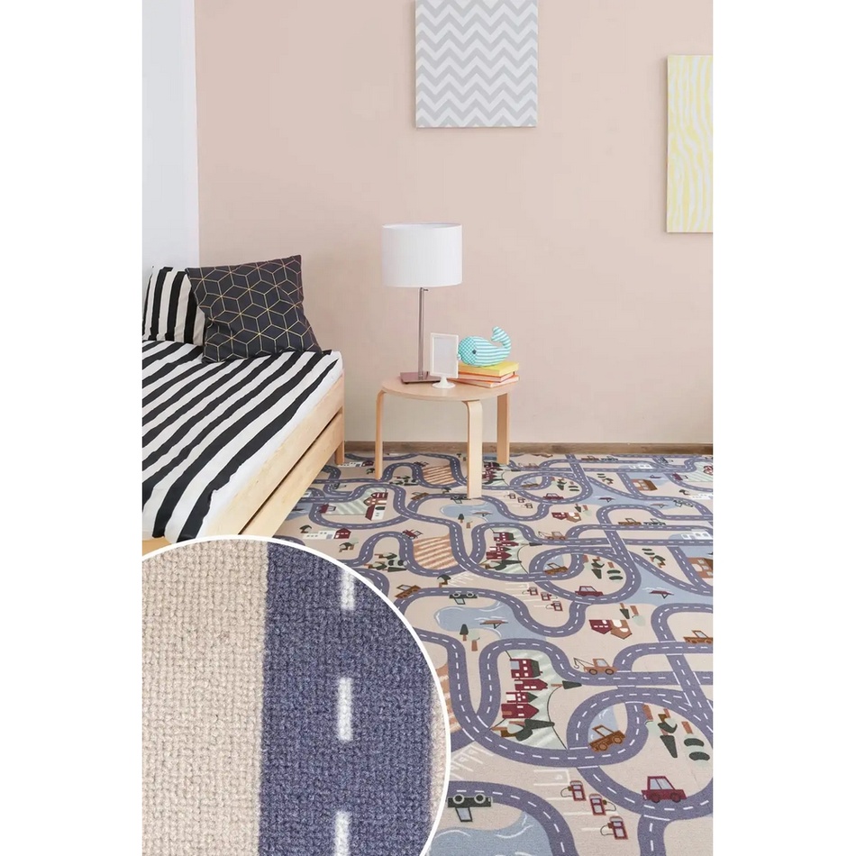 Detský kusový koberec Scanroad má populárny motív ciest, jazdiacich áut, domčekov, budov aj vodných plôch. Koberec je vyrobený zo 100% kvalitného polyamidového vlákna a na spodnej strane disponuje filcovým podkladom. Kusový koberec je vhodný do každej detskej izby a triedy materskej školy.