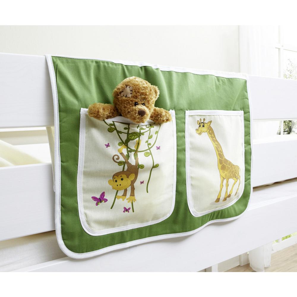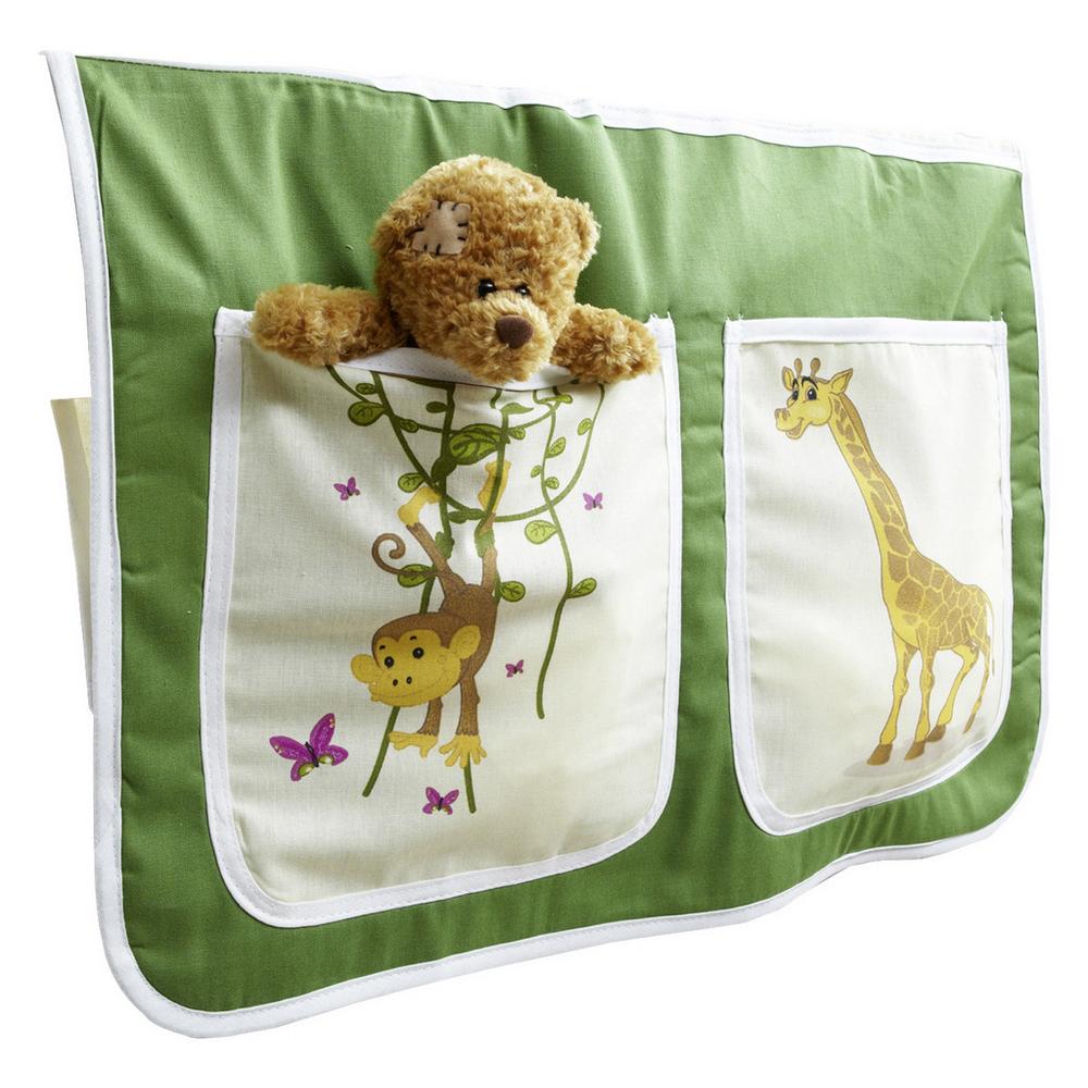 Tento tovar je k dispozícii IBA ONLINE. Táto látková taška dopĺňa detskú poschodovú posteľ o praktickú možnosť úložného priestoru. Je vyrobená zo 100 % bavlny v zelenej a bielej farbe s veselými zvieratkami – žirafou a opicou. Má dve vrecká a ľahko sa pripevňuje na zábradlie postele pomocou suchého zipsu. Vaše deti tak môžu mať časopisy, zošity, denník alebo iné drobnosti na dosah z vonkajšej strany postele. Vrecko možno prať v práčke do 30 °C. Tento posteľný vak sa perfektne hodí k hraciemu tunelu na posteľ, a tiež k poschodovej posteli s domčekovým závesom rovnakej farby! Vyberajte tieto vrecká rôznych farieb a spájajte ich s poschodovými posteľami s farebnými závesmi TIPSI, TOBY, KASPER, THEO, MANUEL, MALTE a SAMMY! K dispozícii sú tiež doplnky ako vankúše a tunely v ladiacich farbách a dizajnoch. Objavte ich a kombinujte! Vyobrazená plyšová hračka nie je súčasťou dodávky. Tento tovar je k dispozícii IBA ONLINE, a zároveň je to tovar s doručením formou DROPSHIPPING. Čo to pre Vás znamená? (DROPSHIPPING) – rýchlejšie doručenie – tovar ide priamo od dodávateľa k Vám a nie z našich skladov alebo predajní, z dôvodu, aby sme Vám tento tovar mohli ponúknuť lacnejšie Avšak ak si budete priať tovar vrátiť alebo rek