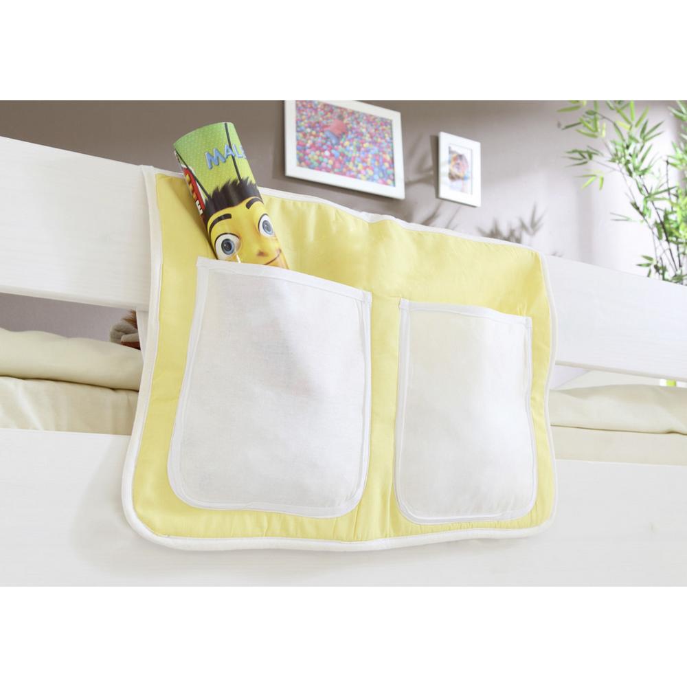 Tento tovar je k dispozícii IBA ONLINE. Táto látková taška dopĺňa detskú poschodovú posteľ o praktickú možnosť úložného priestoru. Je vyrobená zo 100 % bavlny v žlto-bielej farbe. Má dve vrecká a ľahko sa pripevňuje na zábradlie postele pomocou suchého zipsu. Vaše deti tak môžu mať časopisy, zošity, denník alebo iné drobnosti na dosah z vonkajšej strany postele. Vrecko možno prať v práčke do 30 °C. Tento posteľný vak sa perfektne hodí k hraciemu tunelu na posteľ, a tiež k poschodovej posteli s domčekovým závesom rovnakej farby! Vyberajte tieto vrecká rôznych farieb a spájajte ich s poschodovými posteľami s farebnými závesmi TIPSI, TOBY, KASPER, THEO, MANUEL, MALTE a SAMMY! K dispozícii sú tiež doplnky ako vankúše a tunely v ladiacich farbách a dizajnoch. Objavte ich a kombinujte! Tento tovar je k dispozícii IBA ONLINE, a zároveň je to tovar s doručením formou DROPSHIPPING. Čo to pre Vás znamená? (DROPSHIPPING) – rýchlejšie doručenie – tovar ide priamo od dodávateľa k Vám a nie z našich skladov alebo predajní, z dôvodu, aby sme Vám tento tovar mohli ponúknuť lacnejšie Avšak ak si budete priať tovar vrátiť alebo reklamovať, tovar je nutné poslať dobre zabalený od Vás priamo k dodávateľovi, nakoľko sa tovar v našich predajnia