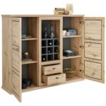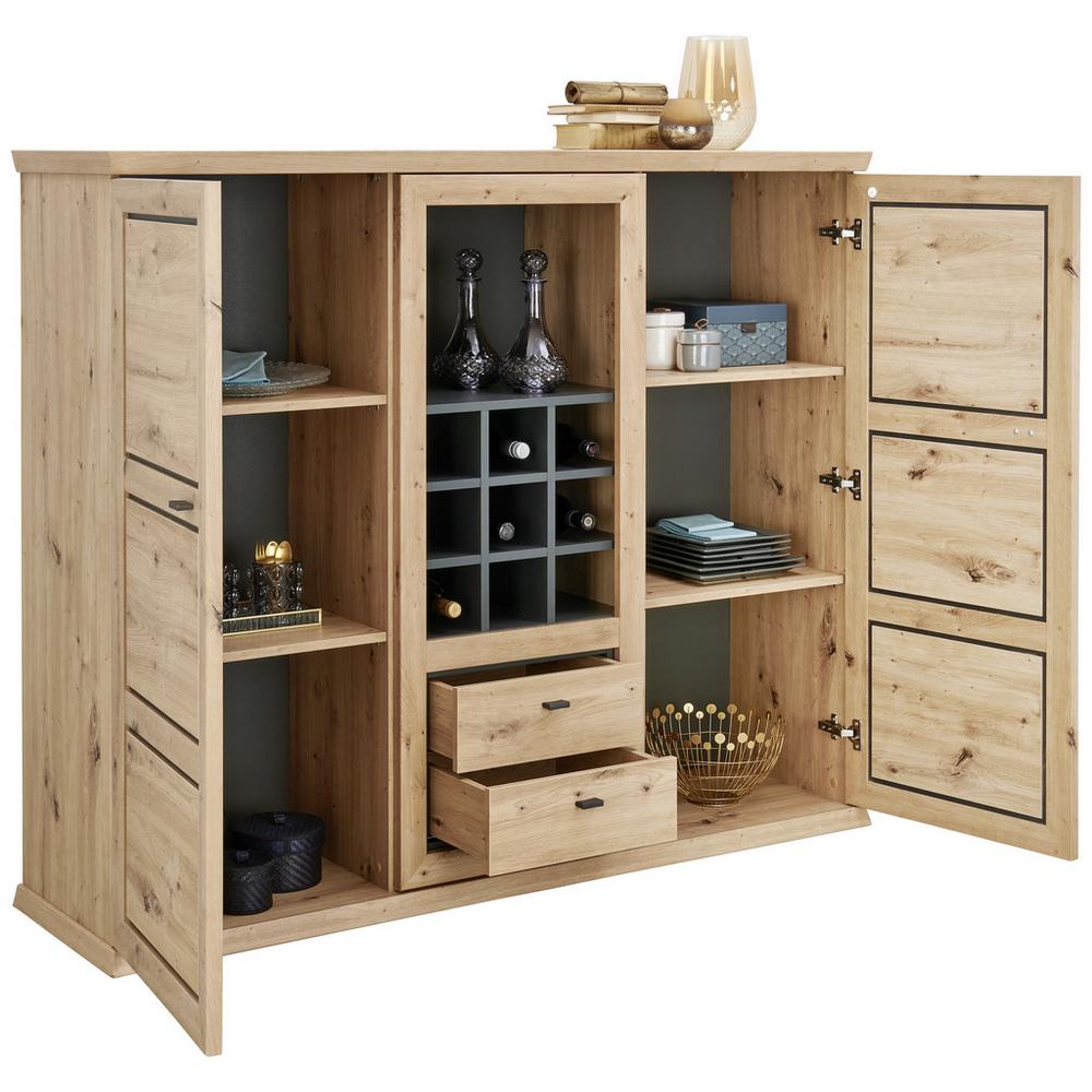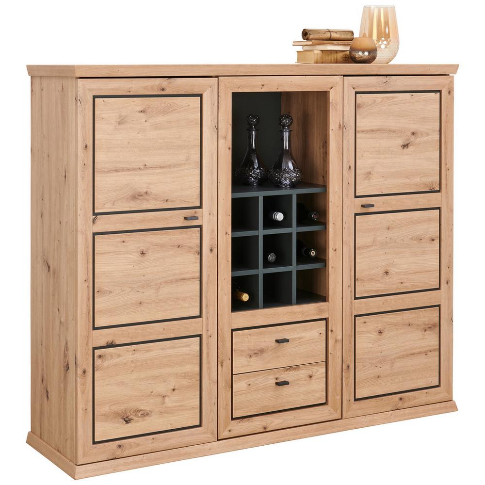 Veľká komoda HARVEY s jedinečným dizajnom sa stane výrazným prvkom vo vašom interiéri. Autentický dekor duba ARTISAN vkusne dopĺňajú antracitovo-sivé rámčeky a lišty úchytiek. Štyri, výškovo nastaviteľné police zakrývajú dve otočné dvere. Skrinka obsahuje tiež dve zásuvky. Získate tak dostatok úložného priestoru na uloženie kníh alebo iných predmetov dennej alebo príležitostnej potreby. Veľká otvorená priehradka a deväť malých priehradok ponúkajú dostatok priestoru na uloženie vína. Vrchná odkladacia plocha so šírkou cca 160 cm môže slúžiť ako polička na dekoratívne predmety, rastliny alebo iné veci.