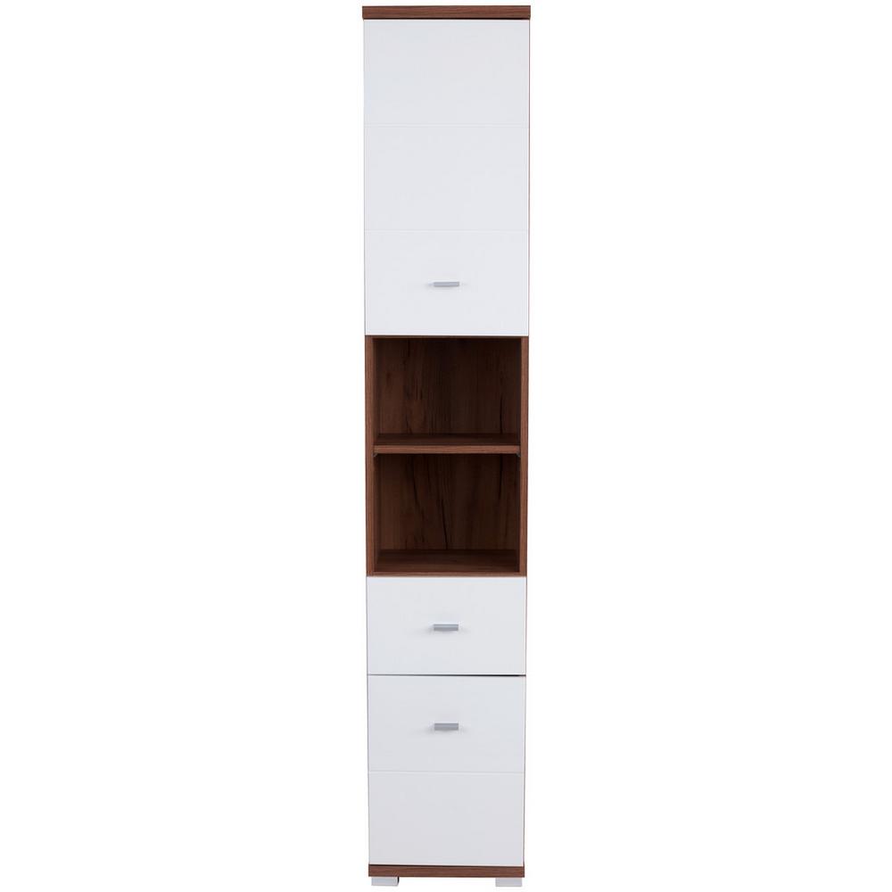 Vysoká skriňa s korpusom v dekore dub Kraft tmavý, čelo MDF biele lakované, s 2 dverami, 1 zásuvkou a 3 policami, úchytky hliníkovej farby.Š/V/H: cca 35,5/190/31,5 cm