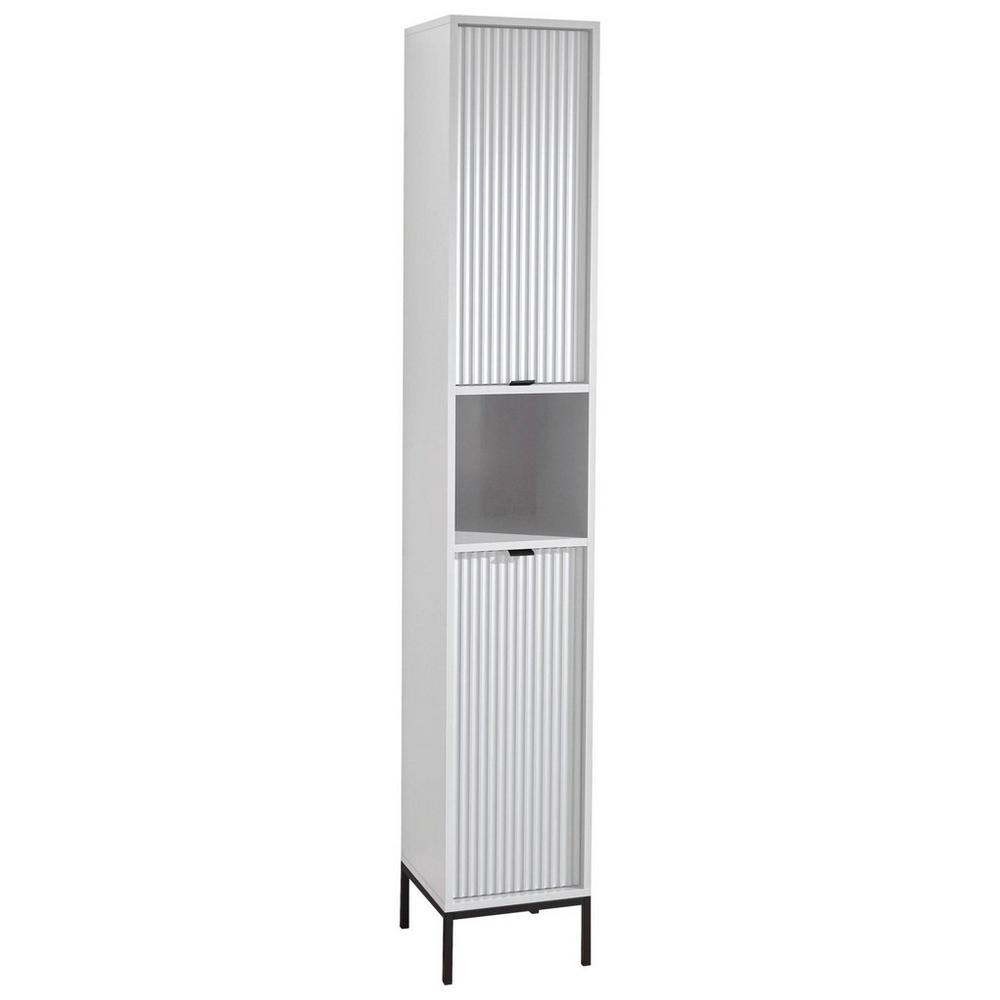 Táto vysoká skrinka MID.YOU v bielej farbe je ideálnym doplnkom k vybaveniu vašej kúpeľne! S rozmermi približne 32 x 195 x 32 cm (š x v x h) šetrí miesto a zároveň ponúka veľa štýlových možností na uloženie kúpeľňových potrieb. Otvorená priehradka v strede je ideálna napríklad na uloženie uterákov pre hostí. Vďaka tomu ich budete mať vždy po ruke, keď ich budete potrebovať.Ďalší úložný priestor sa skrýva za 2 otočnými dvierkami, za ktorými čakajú na využitie celkovo 4 priehradky. Tie sú vymedzené 2 variabilnými policami. Žaluziový vzor 2 otočných dvierok dodáva nábytku v matnej bielej farbe čistý vzhľad. Ak hľadáte kúsok, ktorý sa dá jednoducho kombinovať pre vaše domáce kúpele, vysoká skrinka v bielej farbe je ideálnou voľbou!