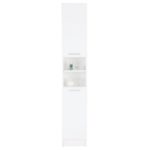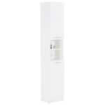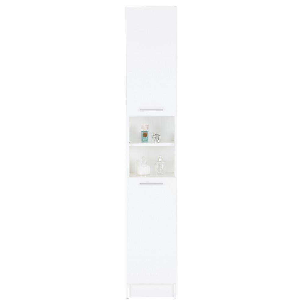 Vysoká skrinka, korpus+front v bielom dekore, 1 dvierka, 2 otvorené priehradky, úchyty striebornej farby. Š/V/H: cca 32,6/189/32,5 cm