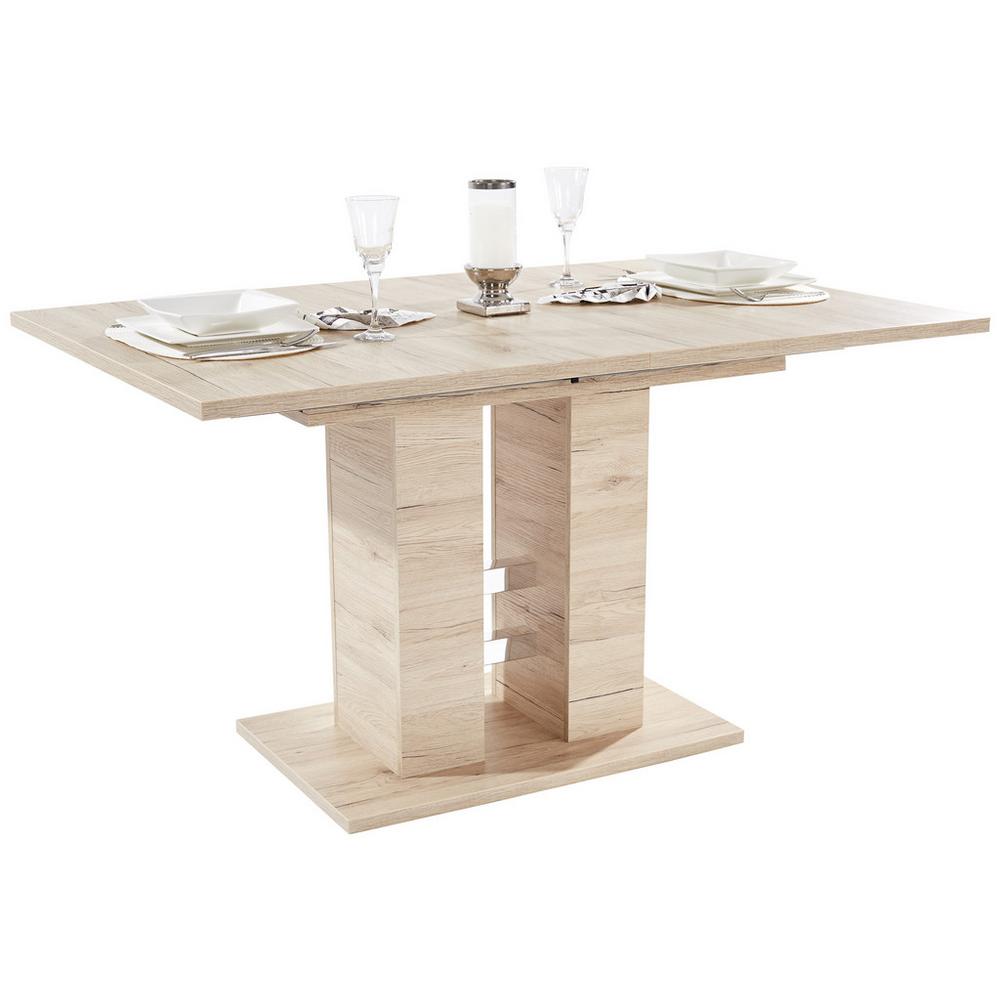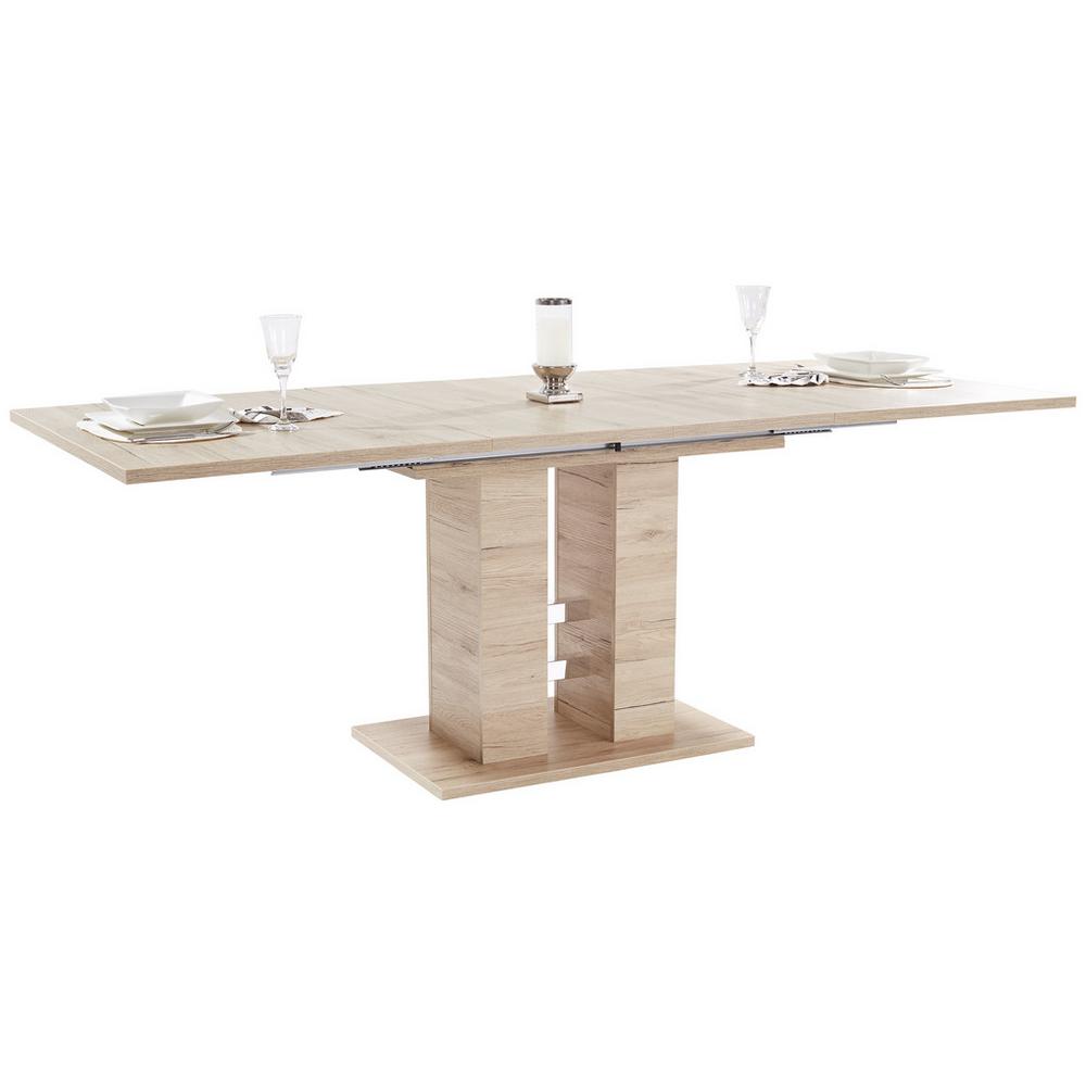 Jedálenský stôl v dekore svetlý dub San Remo, so synchrónnym výsuvom, rozložiteľný až na 220 cm, s melamínovým povrchom odolným voči poškriabaniu. Š/V/H: cca 140/76/90 cm