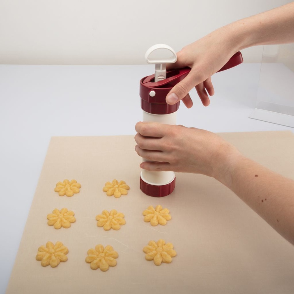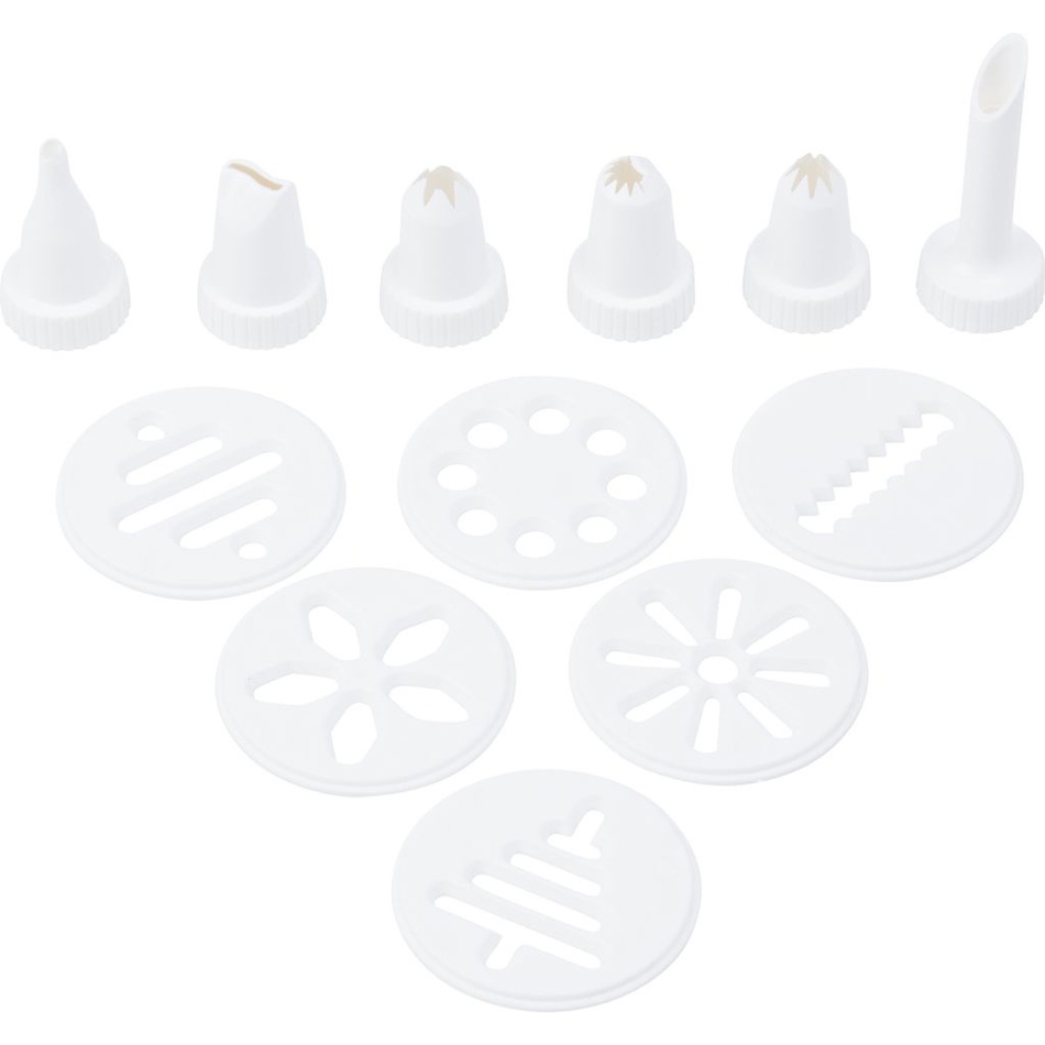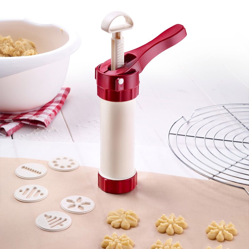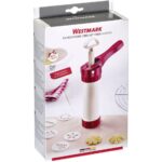 Lis na pečivo a zdobička Luxus od spoločnosti Westmark je skvelý pomocník na spoločné pečenie s deťmi a prípravu lahodných sušienok.Či už ide o pečenie sušienok, krehké pečivo alebo zdobenie tort, tento cukrársky pomocník ponúka riešenie. Lis má zacvakávací zámok. Jedno stlačenie piestu znamená jednu sušienku. Ihneď sa dávkuje. Je to ľahké a zábavné.So 6 formovacími kotúčikmi a 6 plniacimi a zdobiacimi tryskami ponúka lis na pečivo širokú škálu možných aplikácií. Rozmery: 150 x 58 x 208 mmObsah balenia: