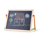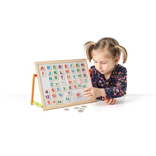 Obojstranná stolná tabuľa má z jednej strany čiernu plochu pre písanie kriedami a z druhej strany bielu magnetickú plochu pre písanie fixkou a nalepovanie magnetických písmeniek. Skvelá hračka pre deti, ktoré nielen zabaví, ale zároveň je rozvíja.