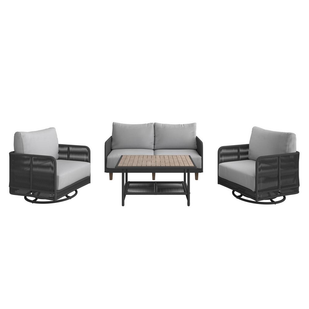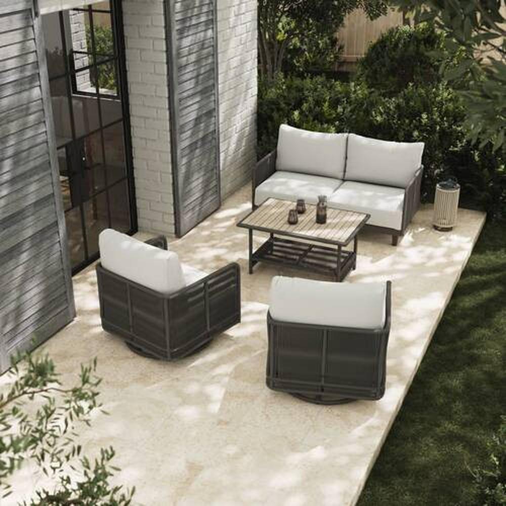 Tento výrobok je dostupný iba ONLINE. Užite si luxus a pohodlie s našou štvordielnou sedacou súpravou v elegantnej kombinácii svetlosivej a tmavosivej farby! Súprava je dokonalým doplnkom na záhradu alebo terasu, pretože s atraktívnym prevedením a celkovými rozmermi cca 146 x 60 x 72 cm (Š x V x H) pozýva k oddychu, či už cez deň alebo večer. Sedenie pozostáva z dvoch kresiel, ktoré sú otočné, čo je veľmi užitočná vlastnosť pri vstávaní aj sadaní. U žiadne náročné odsúvanie nábytku! Každé z kresiel možno zaťažiť až 160 kilogramami, a sú vybavené hrubými sedacími poduškami a taktiež robustnými chrbtovými vankúšmi, ktoré poskytujú maximálny komfort pri opieraní. Priestranná lavica s nosnosťou až 360 kg je tak isto ako aj kreslá, vybavená mäkkými poduškami a chrbtovými vankúšmi. Odnímateľné poťahy umožňujú jednoduché čistenie a údržbu. Sedacia súprava je vyrobená z vysoko kvalitného hliníka odolného voči hrdzi, vďaka čomu je trvácna a odolná voči poveternostným vplyvom. Matný povrch a výplet s ratanovým efektom dodávajú nábytku moderný vzhľad. Zostavu dopĺňa záhradný stôl s rozmermi asi 92 x 47 x 60 cm (Š x V x H) a nosnosťou 30 kg<