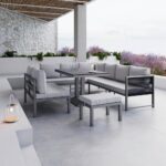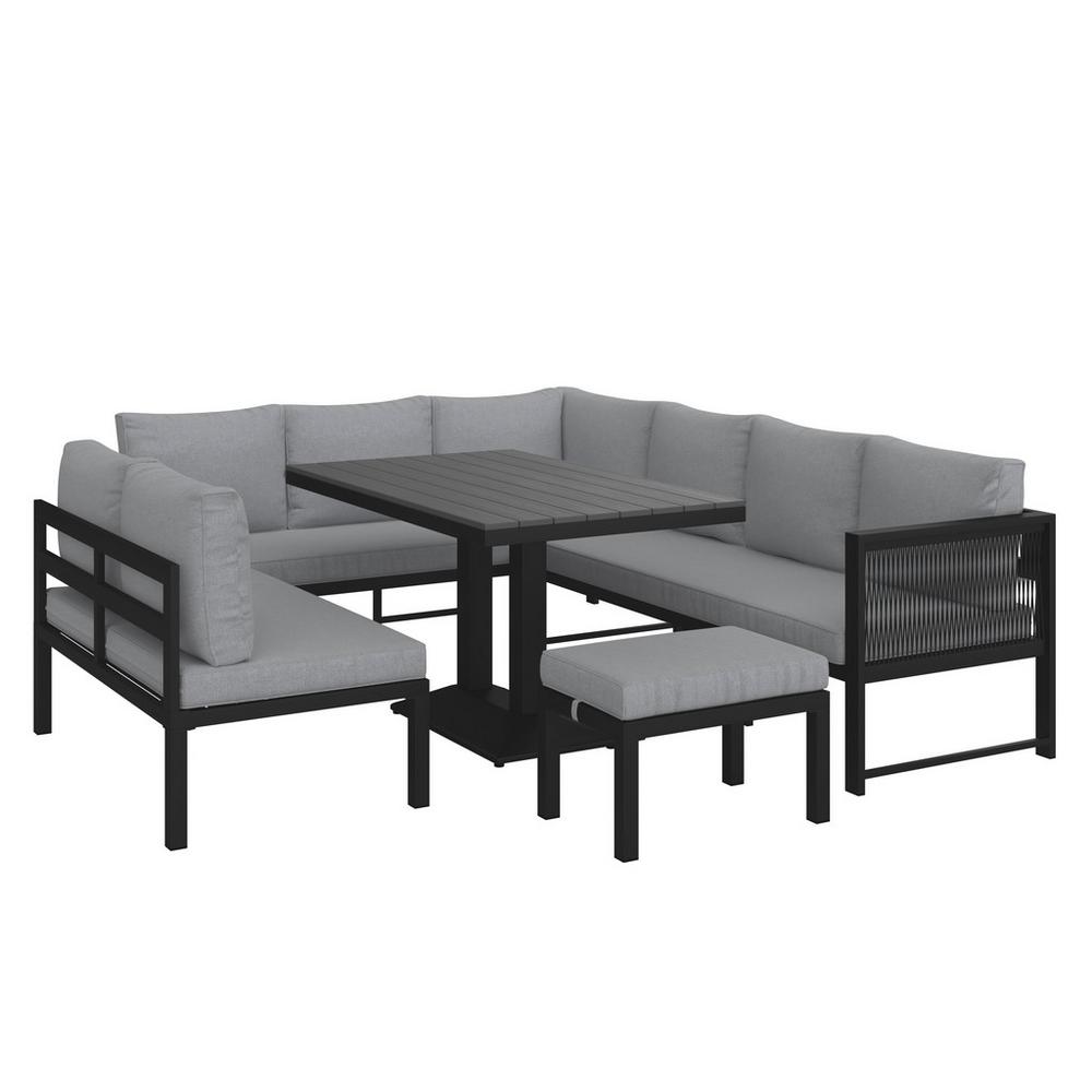 Tento výrobok je dostupný iba ONLINE. Zažite oddych vonku s našou všestrannou, päťdielnou záhradnou súpravou s elegantnými sivými tónmi – ideálny nábytok do záhrady alebo na terasu. Veľkorysé rozmery cca 192 x 67 x 69 cm (Š x V x H) ponúkajú dostatok priestoru aj pre spoločenské stretnutia. Súprava obsahuje jednu rohovú a jednu menšiu lavicu, praktickú taburetku a odolný, vysoký stôl. Sedací nábytok je pre maximálne pohodlie doplnený deviatimi chrbtovými vankúšmi a tromi sedacími vankúšmi. Vďaka odnímateľným poťahom z kvalitného polyesteru sa ľahko čistia a udržiavajú. Záhradný nábytok je vyrobený z kvalitného kovu, plastu a textilu, a ponúka dokonalé spojenie štýlu a funkčnosti. Liatina s práškovým nástrekom a materiál Polywood®, odolné voči poveternostným vplyvom, zaisťujú trvanlivosť. Užite si nezabudnuteľné hodiny, strávené vonku s naším pohodlným záhradným nábytkom! Upozorňujeme, že tento tovar nie je vystavený v našich pobočkách, je možné ho získať IBA ONLINE v našom internetovom obchode alebo na požiadanie v ktorejkoľvek kamennej predajni. Doručenie priamo domov k zákazníkovi je vždy zadarmo.
