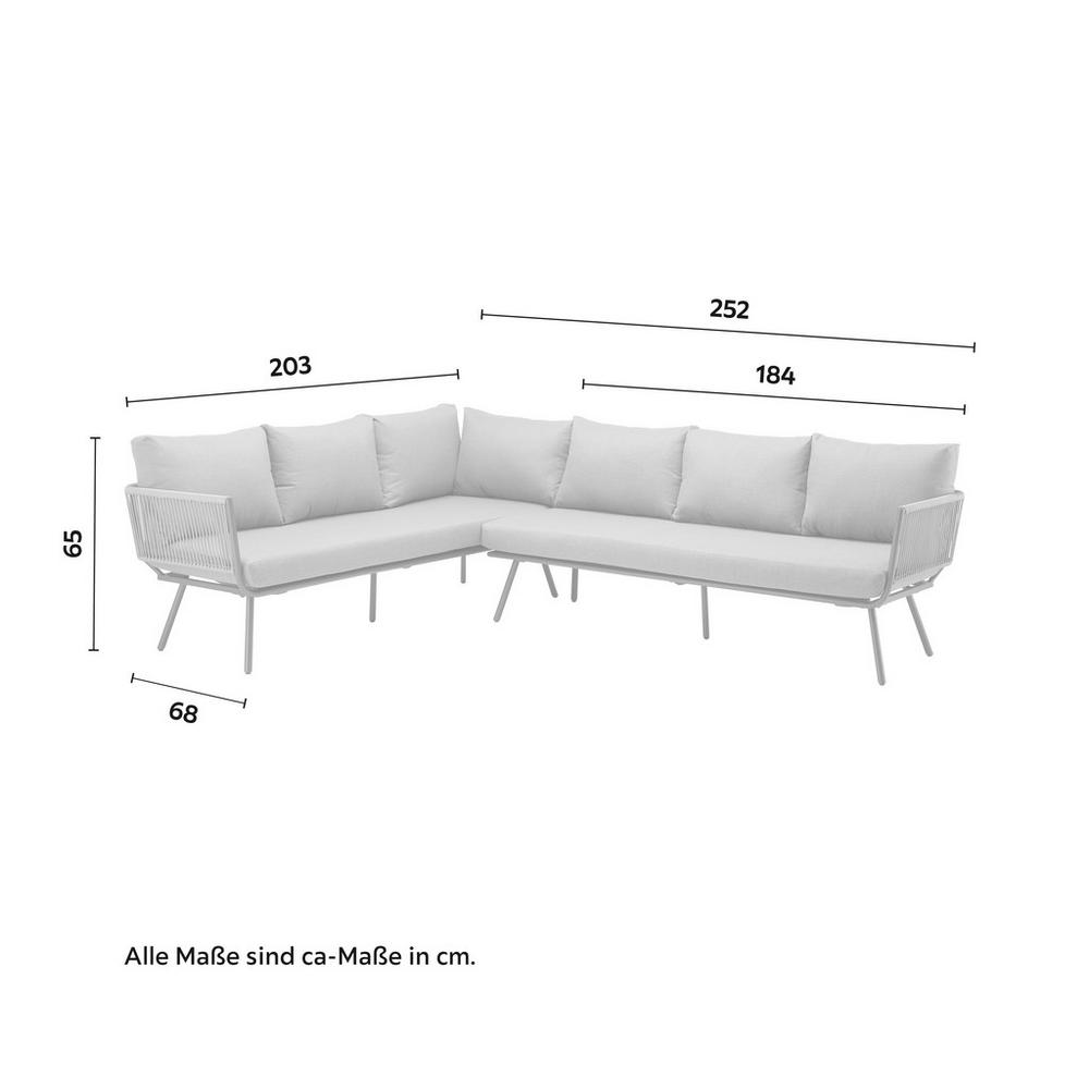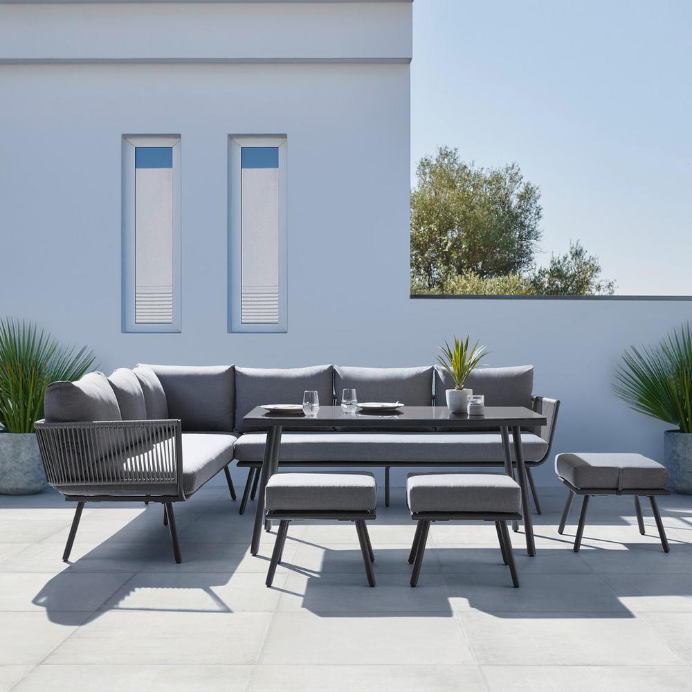 Tento výrobok je k dispozícii iba ONLINE. Tento sedací salónik v sivej farbe ponúka štýlové miesto na oddych v letných mesiacoch. Rohová sedacia súprava, tvorená z dvoch lavíc, má robustný kovový rám doplnený o výplet z textilného lana. O pohodlie pri sedení sa postarajú vysoko kvalitné, mäkké čalúnené sedáky a operadlá. Ďalšie miesta na sedenie tvoria 3 taburety. O stolovanie či odkladanie chladených nápojov sa postará 1 veľký stôl so sklenenou doskou. Najdôležitej≻a