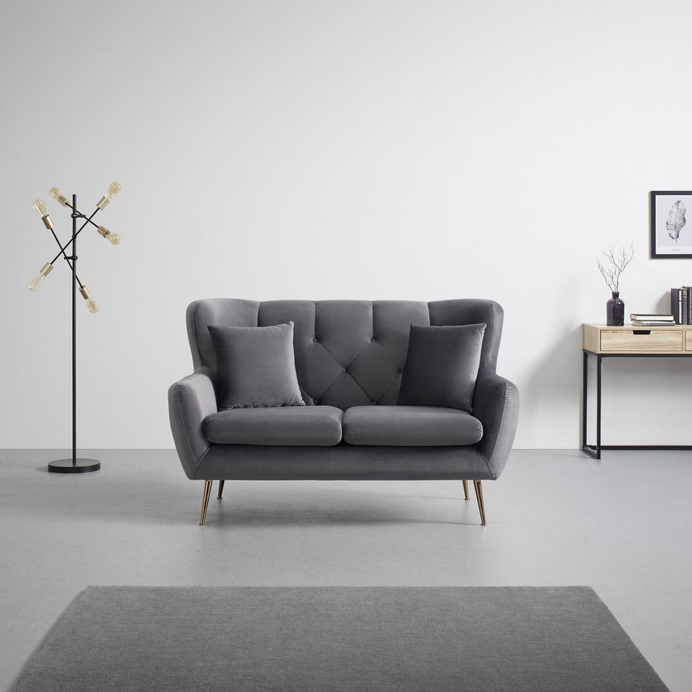 Tento tovar je k dispozícii IBA ONLINE.S touto pohovkou v sivej farbe s plyšovým mäkkým zamatovým poťahom zo 100% polyesteru získate doma útulné štýlové sedadlo. Pohovka má približne rozmery 148 x 95 x 93 cm (Š x V x H). Vyvýšené operadlo a asi 42 cm vysoké podrúčky vytvárajú pocit pohody. Atraktívny vzhľad podčiarkujú ozdobné prešívanie a gombíky v oblasti operadla. Okrúhle trubicové nožičky vo farbe ružového zlata sú obzvlášť krásnym pútačom pozornosti. Dva veľké dekoračné vankúše približne 40 x 40 cm (Š x D) vyplnené pohodlnou penou a 2 veľké vankúše sedáku približne 60 x 57 cm (Š x D), ktoré sú vyplnené penou, zaisťujú optimálny komfort sedenia. Pohovka, ktorú je možné zaťažiť až do 240 kg, ponúka priestor pre 2 osoby.Tento tovar sa nenachádza na našich predajniach. Objednať si ho môžete cez e-shop Möbelix.