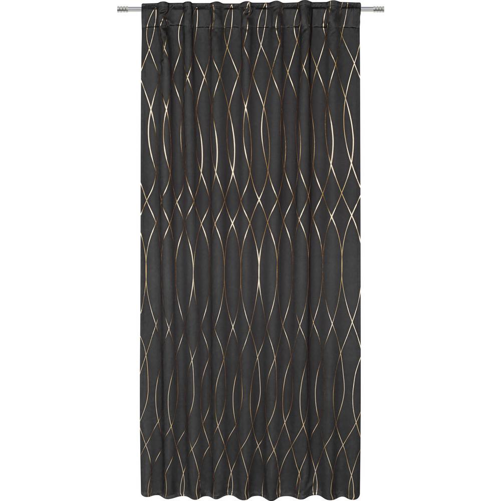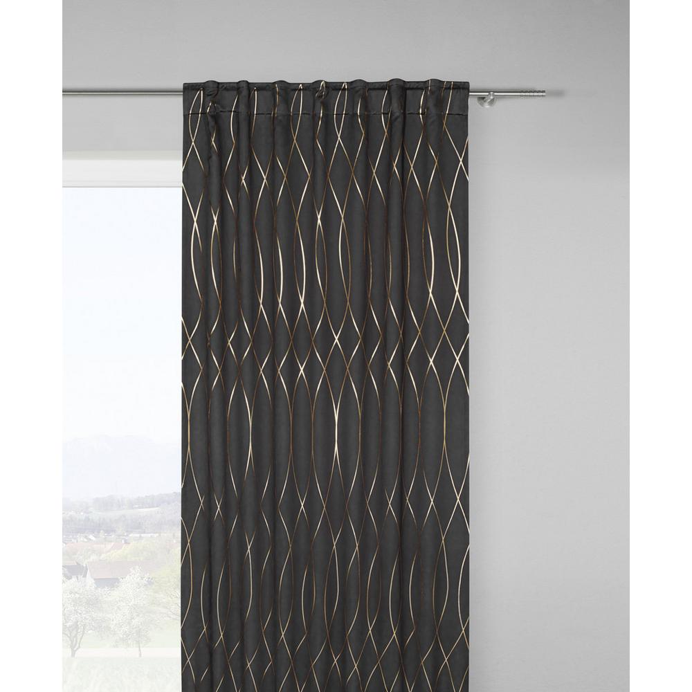 Štýlová elegancia pre váš príbytok – táto atraktívna zatemňujúca clona vám ponúka štýlovú ochranu pred slnkom a súkromie pre váš domov. Je vhodná na zavesenie na tyče aj garníže. Nepriehľadný záves, s veľkosťou 140 x 245 cm (Š/D), je vyrobený zo 100 % polyesteru v čiernej farbe s ozdobou – lesklými vlnkami medenej farby. Zatemňovaciu clonu odporúčame prať ručne.