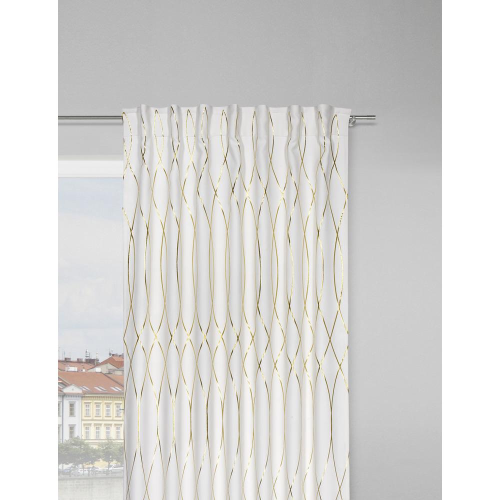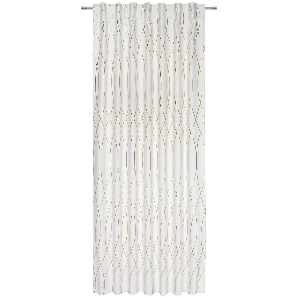 Štýlová elegancia pre váš príbytok – táto atraktívna zatemňujúca clona vám ponúka štýlovú ochranu pred slnkom a súkromie pre váš domov. Je vhodná na zavesenie na tyče aj garníže. Nepriehľadný záves, s veľkosťou 140 x 245 cm (Š/D), je vyrobený zo 100 % polyesteru v bielej farbe s ozdobou – lesklými vlnkami zlatej farby. Zatemňovaciu clonu odporúčame prať ručne.