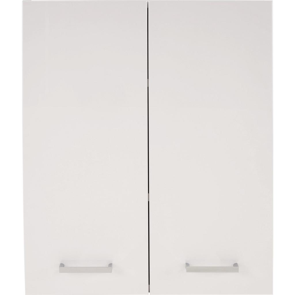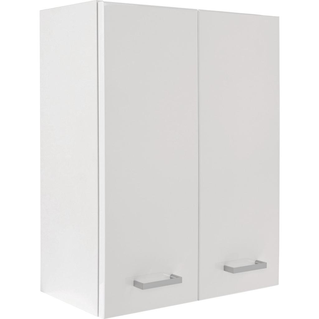 Závesná skrinka s korpusom v bielom dekore, s čelami v bielej, MDF, lakované, vo vysokom lesku, s 2 dvermi, s kovovými úchytkami farby chrómu, s 1 vkladacou policou s hr.16 mm. Š/V/H: 50/60/21,6 cm