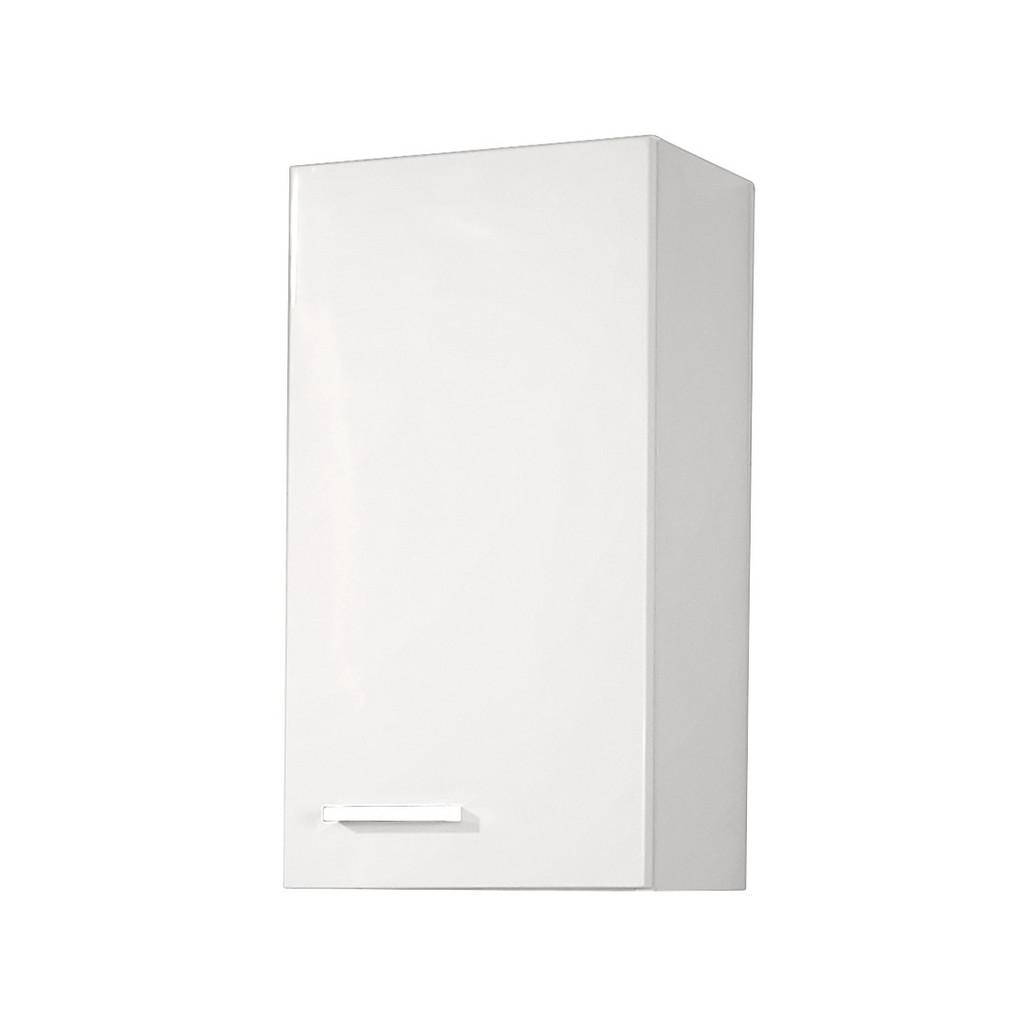 Závesná skrinka v bielom dekore, vo vysokom lesku, s 1 dvermi, s kovovými úchytkami farby chrómu a s 1 vkladacou policou. Š/V/H: cca 30/60/21,6 cm