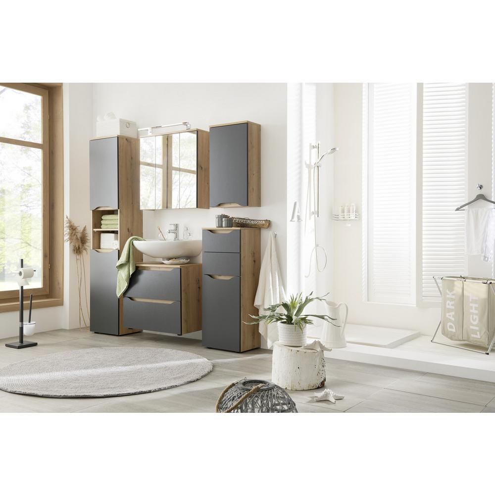 Séria kúpeľňového nábytku GIGA zaisťuje modernosť a prirodzený nádych vo vašom osobnom wellness chráme doma. Kým je korpus v dekore dub artisan, predné časti s frézovanými úchytkami v antracitovej farbe vytvárajú chladný kontrast. Využite príležitosť a skombinujte jednotlivé kusy nábytku v sérii podľa svojich okolností na mieste!Závesná skrinka s rozmermi cca 40 x 70 x 20 cm (Š x V x H) obsahuje skrinkovú priehradku s dvierkami a dvoma nastaviteľnými policami. Je tu dostatok miesta na ošetrujúce výrobky, kozmetické výrobky a mnoho ďalších. Kĺb dverí je možné v prípade potreby zmeniť.S touto nástennou skrinkou zaistíte moderný vzhľad vo vašej kúpeľni!