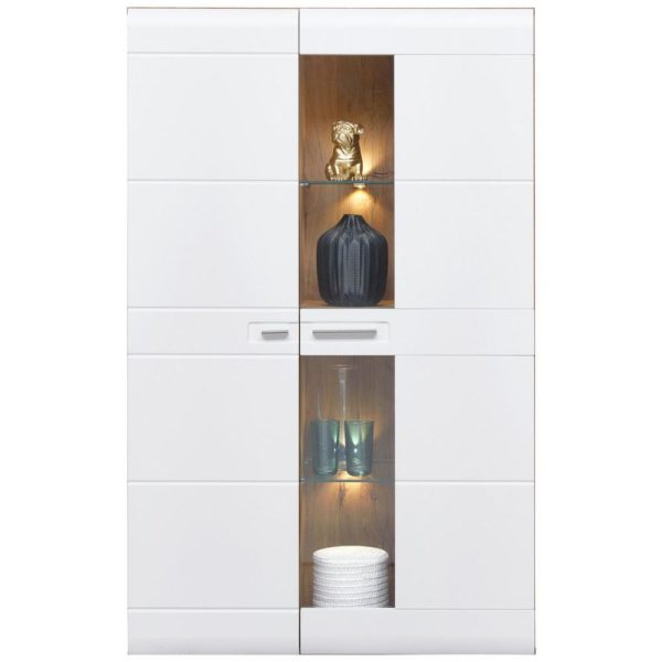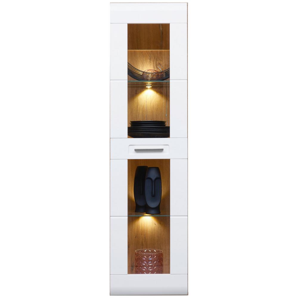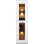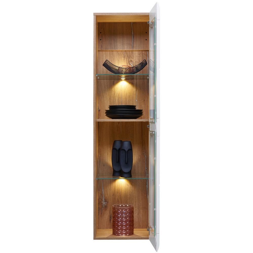 Závesná vitrína AURIS od značky LUCA BESSONI je estetickým pútačom v obývacej izbe, a zároveň pôsobí aj veľmi diskrétne. Prezentuje sa vo funkčnom štýle s množstvom úložného priestoru. AURIS má rozmery cca 40,3 x 153,4 x 37,1 cm (Š x V x H) a je vyrobený z robustného, dreveného materiálu a skla. O neodolateľnú domácu atmosféru sa postarajú povrchy: Predná strana s matnou bielou farbou je doplnená korpusom s moderným dekorom starého dreva – vo vzhľade dub flagstaff, ktorý sa vyznačuje vyobrazením realistických prasklín a chorôb starého dreva, a oživuje tak jeho celú kresbu. Oba typy povrchov sú potiahnuté melamínovou živicou, pre lepšiu údržbu a odolnosť. Za presklenými otočnými dvierkami s obojstranne montovateľnými pántami a so systémom soft-close nájdete reprezentatívne množstvo priestoru na obľúbené predmety a fotografie, ktoré chcete vystaviť. Pomocou jednej plastovej úchytky vo farbe ocele sa dostanete do interiéru skrinky, ktorý ukrýva jednu pevnú, drevenú policu a dve polohovateľné, sklenené police. Tie možno zaťažiť do 3 kg. Celková nosnosť vitríny je max. 30 kg. Voliteľne dostupné osvetlenie urobí z tohto kusu nábytku dokonalý vrchol zariadenia. Náš tip: Objavte ďal&