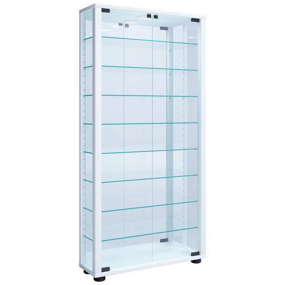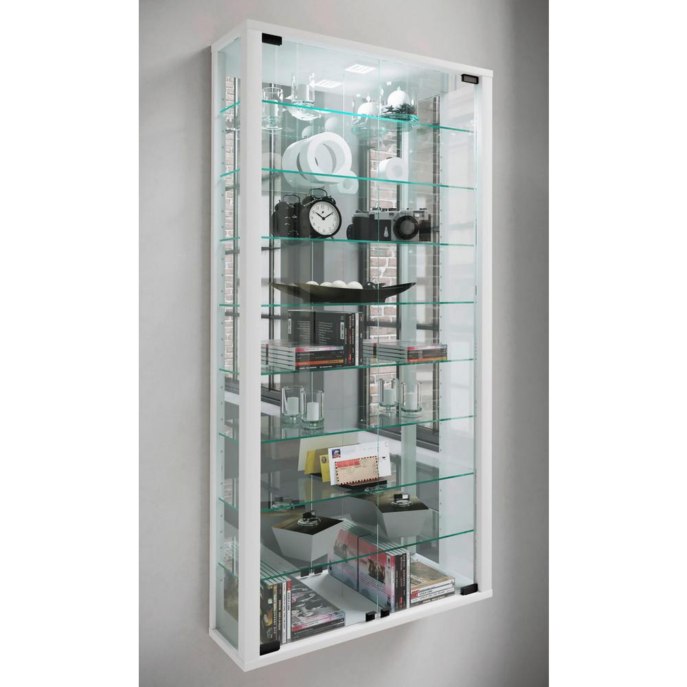 Tento tovar je dostupný iba ONLINE. Dekoratívne zvýraznenie: So štýlovou závesnou vitrínou VITROSA od značky MID.YOU môžete predviesť svoje obľúbené kúsky extravagantným spôsobom! Nástenná vitrína s rozmermi približne 59 x 114,3 x 18 cm (Š x V x H) presviedča pôsobivým vzhľadom a sofistikovanými funkciami, ktoré zaručujú efektívne pútavé prvky, ako sú otočné dvere a sklenené bočné vložky pre optimálne svetlo a perfektný pohľad z viac uhlov, zatiaľ čo osem sklenených políc poskytuje pódium pre vaše exponáty – nevyhnutnosť pre každého, kto chce dať svojej vášni pre zberateľstvo štýlové prostredie! Súčasťou je aj LED osvetlenie, pre ešte väčší lesk a zvýraznenie vystavovaných predmetov. Zvláštnosťou je zrkadlová zadná stena, ktorá svojím odrazom zaručí pôsobivý pohľad a dodá vášmu interiéru luxusný upgrade – vaše poklady budú prezentované veľkolepým spôsobom! Vitrína má jednoduchý rám bielej farby, preto sa harmonicky hodí do širokej škály štýlov zariadenia a vďaka povlaku z melamínovej živice je odolná voči každodennému opotrebovaniu. Poličky sú výškovo nastaviteľné, a tak ponúkajú množstvo skvelých možnost&ia