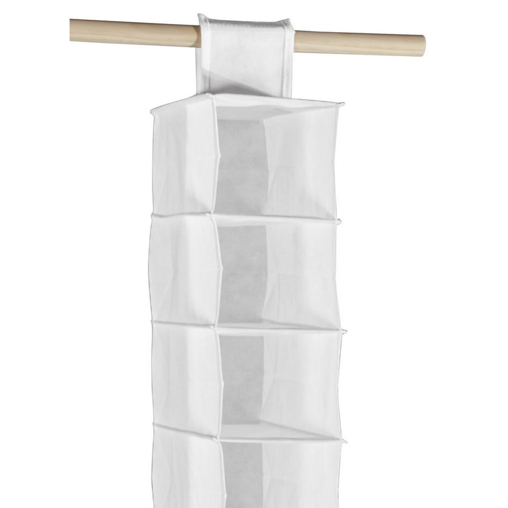 Praktický skladací box z bielej textílie. S 10 odkladacími priečinkami na zavesenie. Š/V/H: 15,5 x 120 x 30 cm.