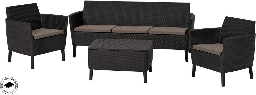 Zostava nábytku SALEMO vynikne na každej záhrade aj v interiéri svojou eleganciou a funkčnosťou. Súprava v imitácii ratanu sa skladá z 2 kresiel, 3miestnej lavice a stola. Súčasťou sú aj pohodlné podsedáky vo farbe konštrukcie. Stôl skvele poslúži aj ako úložný box. Konštrukcia nábytku je ľahká a zároveň stabilná. Nábytok sa veľmi ľahko udržuje a navyše je vysoko odolný proti UV žiareniu a poveternostným vplyvom.Materiál: lisovaný plast, textil. Rozmer 2 ks balenia: 120 x 80 x 39 cm, 120 x 80 x 37 cm.Rozmery:- výška kresla 76 cm- šírka kresla 76 cm- dĺžka kresla 67 cm- výška lavice 76 cm- šírka lavice 187 cm- dĺžka lavice 67 cm- výška stola 42 cm- šírka stola 56 cm- dĺžka stola 76 cm- výška sedu od zeme 38 cm bez podsedáku, 43 cm s podsedákom- hĺbka sedu 50 cm- šírka sedu 50 cm- nosnosť kresla 110 kg- nosnosť lavice 3 x 110 kg- nosnosť stola 50 kg- celková hmotnosť 49 kg Zostava záhradného nábytku Komfortná 2 kreslá, 3miestna lavica, stôl Imitácia ratanu Elegantná a štýlová Ľahká a stabilná Pohodlné podsedáky súčasťou Stôl s funkciou úložného boxu Odolná proti UV žiareniu a poveternostným vplyvom