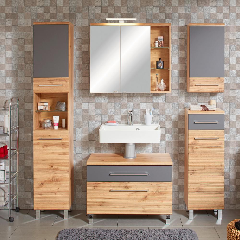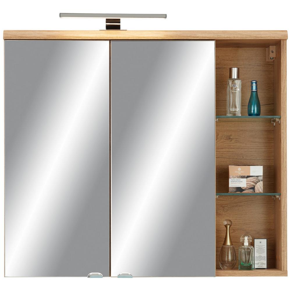 Skrinka so zrkadlom v dekore dub Wotan s 2 zrkadlovými dverami, 3 otvorenými priehradkami so sklenenými policami. V skrinke sú 2 vkladacie police a je vybavená LED osvetlenímŠ/V/H: cca 80/70/23 cm